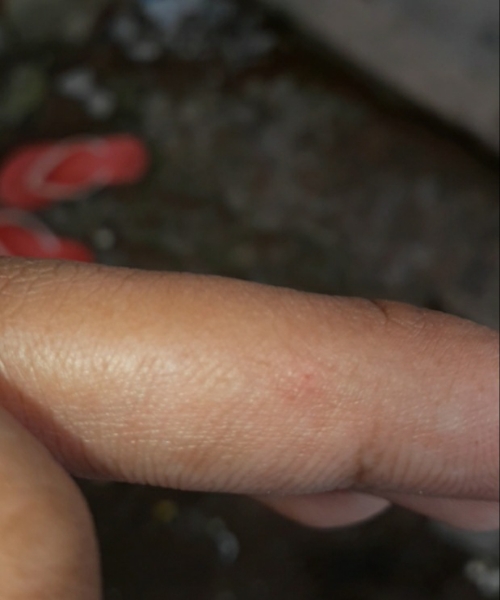 Mà em ngón tay bên trái của em mới va trúng răng của nó hồi tối 19/11 rồi em có về rửa bằng cồn 70° nhưng không thấy rát nhưng sáng hôm sau thì em thấy ngón tay của em nó bị rách da nhưng không có máu và có chấm đỏ
