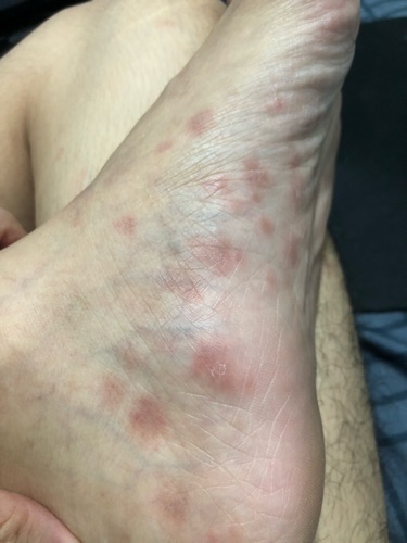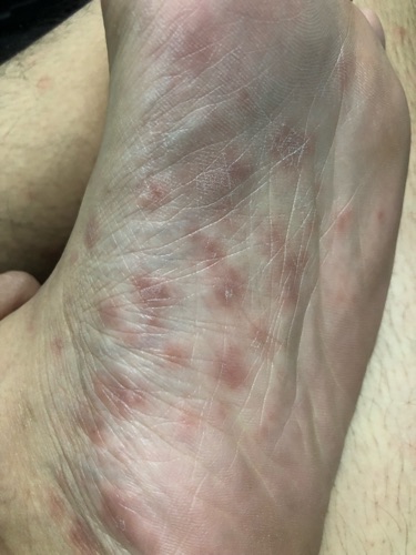 Em bị nổi nhiều vết đỏ (ít ngứa ) như thế này hơn 1 tuần rồi . Lúc đầu chỉ có ở bàn chân nhưng giờ đã mọc rãi rác trên người. Cho em hỏi em bị gì vậy ạ