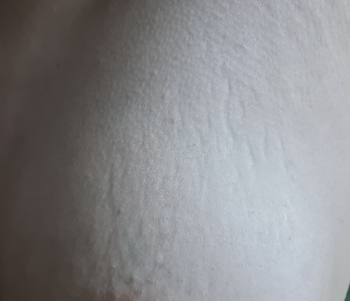 Khoảng 2 năm đổ lại thì phía trên ngực của em có dấu vết hằn sáng màu khi kéo dãn da ra, đến nay thì nó rõ ra các vết hằn lõm vô luôn (cả 2 bên).