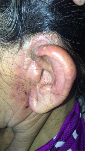 Bác sĩ ơi, bà nội cháu năm nay 74 tuổi tai tự nhiên nổi mảng như vầy sưng tấy đau nhứt. Đây là bệnh gì vậy ạ?