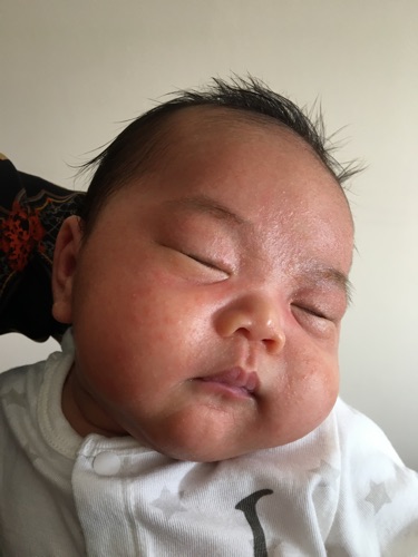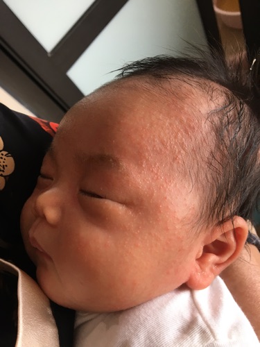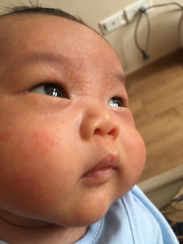 Bác sĩ cho em hỏi con em được 1 tháng tuổi, 5 ngày nay cháu mẩn nhiều nốt đỏ trên mặt và gáy, lưng như trong ảnh. Phần lồn mày có xuất hiện vảy cứng hơi có màu vàng. Không biết đây là bệnh gì và có cách nào để chữa không ạ? Mẹ cháu đang viêm tuyến sữa và dùng thuốc kháng sinh Augmentin và Alphachoay không biết có liên quan không ạ? Cảm ơn bác sĩ nhiều