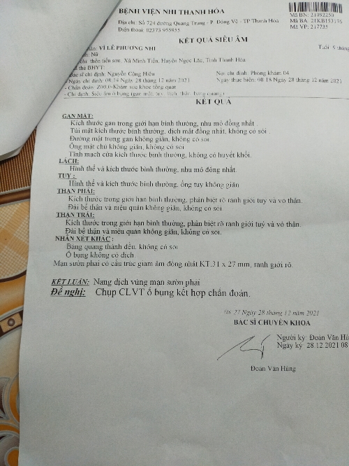 Chào bác sĩ, bé nhà e được 9 thang, e cho bé đi khám ở bệnh viện nhi thanh hoá biết bé có nang ở mạn sườn bên phải, mấy hôm vừa rồi bé có nôn, có lúc nôn cả ra dịch màu nâu thâm, bé bú ít, ăn ít. Mỗi lần nôn bé mệt lã người chỉ nằm ngủ ko chơi ko đùa. Mong các sĩ tư vấn giúp gia đình với ạ.