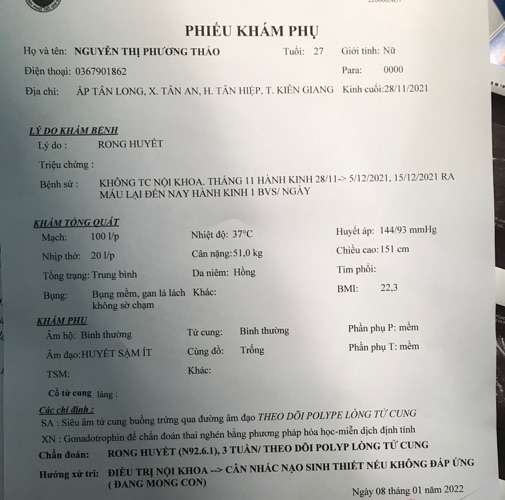 Chào bác sĩ! Em bị ra máu âm đạo bất thường, đi khám và siêu âm có kết quả như hình. Bs nói ngắn gọn là trong lòng tử cung em có 1 cục thịt thừa, vì chưa có em bé nên Bs chỉ cân nhắc làm nạo sinh thiết, và cho uống thuốc cầm máu. Em muốn hỏi là khối Echo dày và Polype lòng tử cung là giống nhau hay sao ạ? Theo dõi Polype lòng tử cung nghĩa là em đã bị Polype lòng tử cung hay sao ạ? Làm nạo sinh thiết lòng tử cung nghĩa là nạo triệt tiêu cục thịt thừa trong tử cung hay như thế nào ạ? Và có ảnh hưởng gì đến việc có em bé sau này không ạ? Cảm ơn Bs!