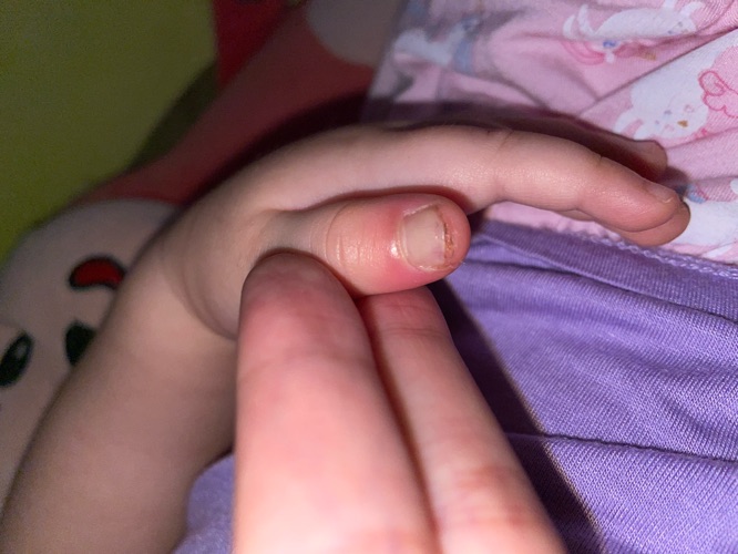 E chào bác sỹ ạ!! E có 1 vấn đề muốn hỏi đó là bé nhà e bị kẹp ngón tay vào cánh cửa, bây giờ ngón tay bé có hiện tượng như thế này thì e nên bôi gì cho bé được ạ? E ko dám bôi thuốc linh tinh cho bé nên mới chỉ rửa nước muối cho con thôi ạ. E cảm ơn bác sỹ ạ!!