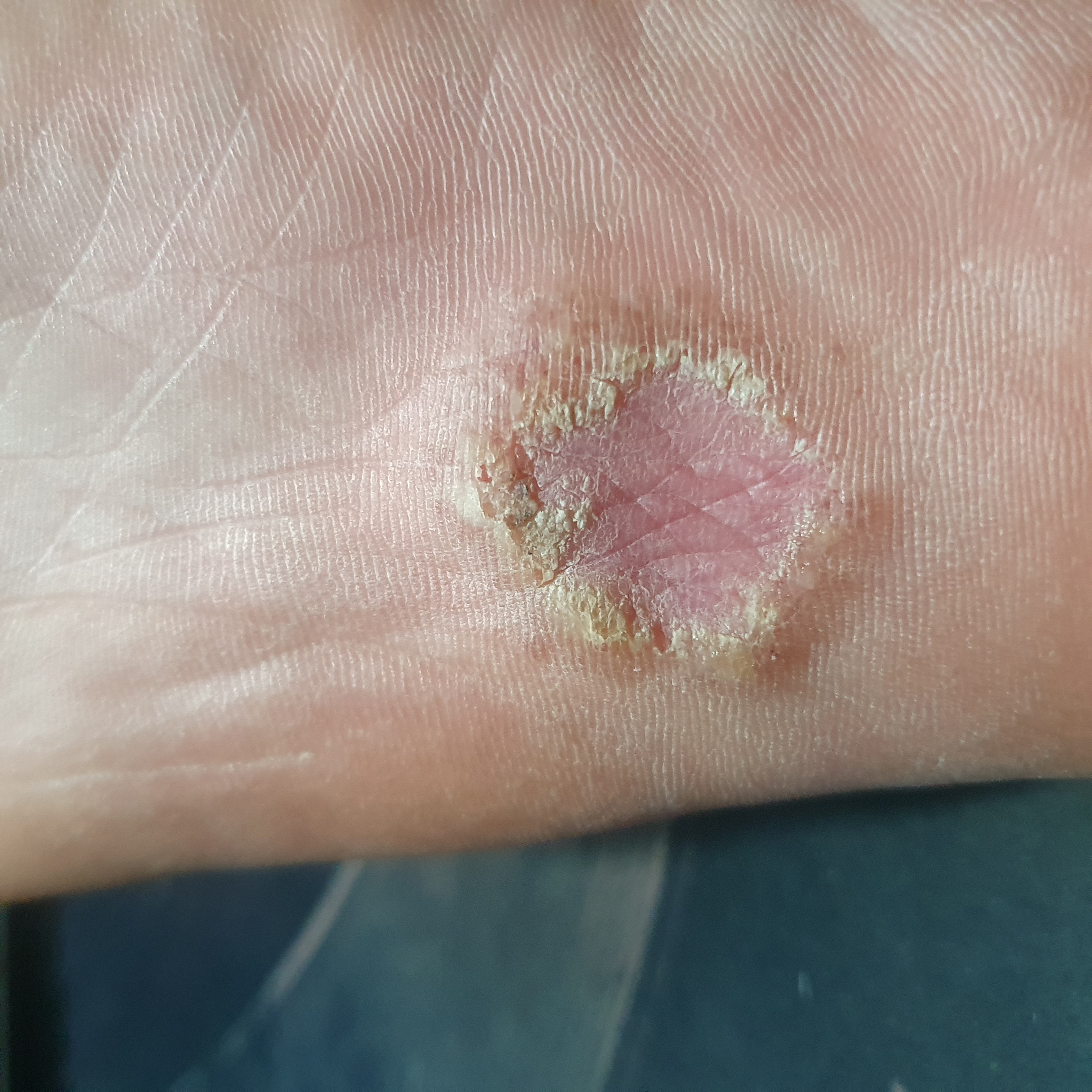 Gần đây em bị tình trạng lòng bàn chân ngứa, bong phần da dày của lòng bàn chân, để lộ lớp thịt mỏng, không rướm máu. Xung quanh bị bong, rộp lên, và bóp mạnh sẽ có nước. Phần da bong khá cộm và ngứa, đi lại hơi khó chịu