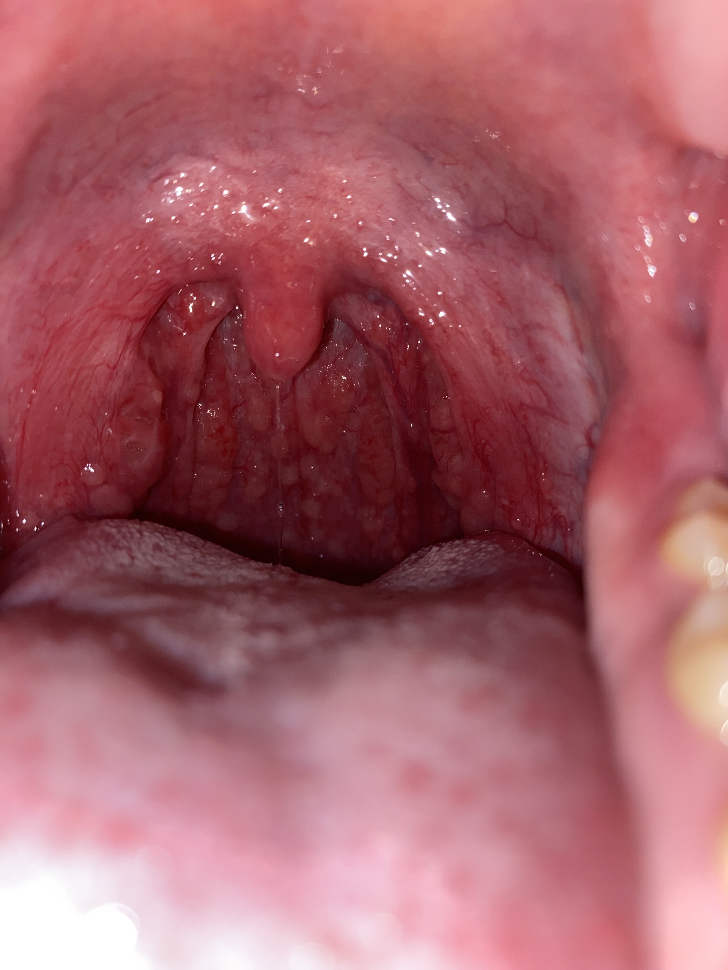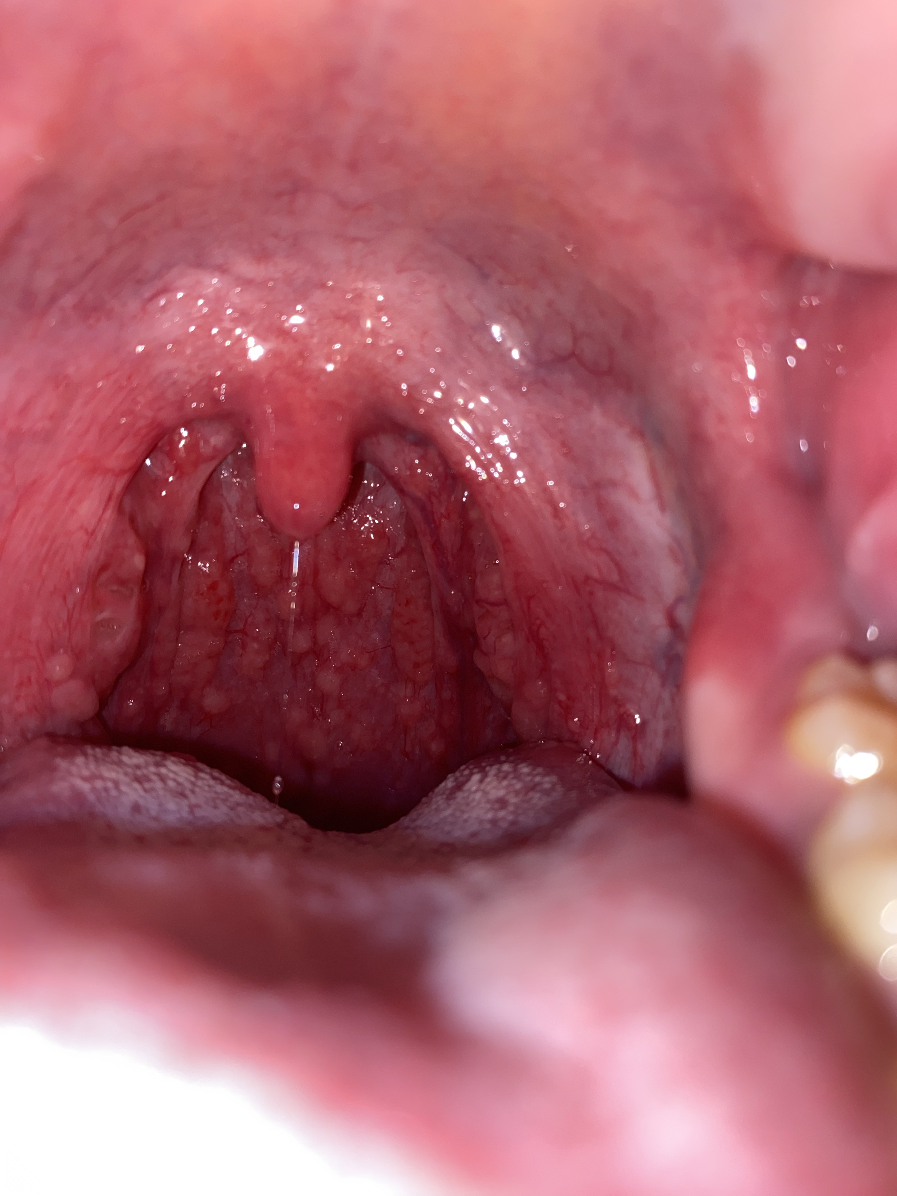 Cháu chào bác sĩ ạ bác sĩ cho cháu hỏi là gốc lưỡi và họng cháu bị như này là sao ạ ( cháu bị gần 4 tuần rồi ạ và thi thoảng cháu nuốt nước bọt thấy đau họng ạ )