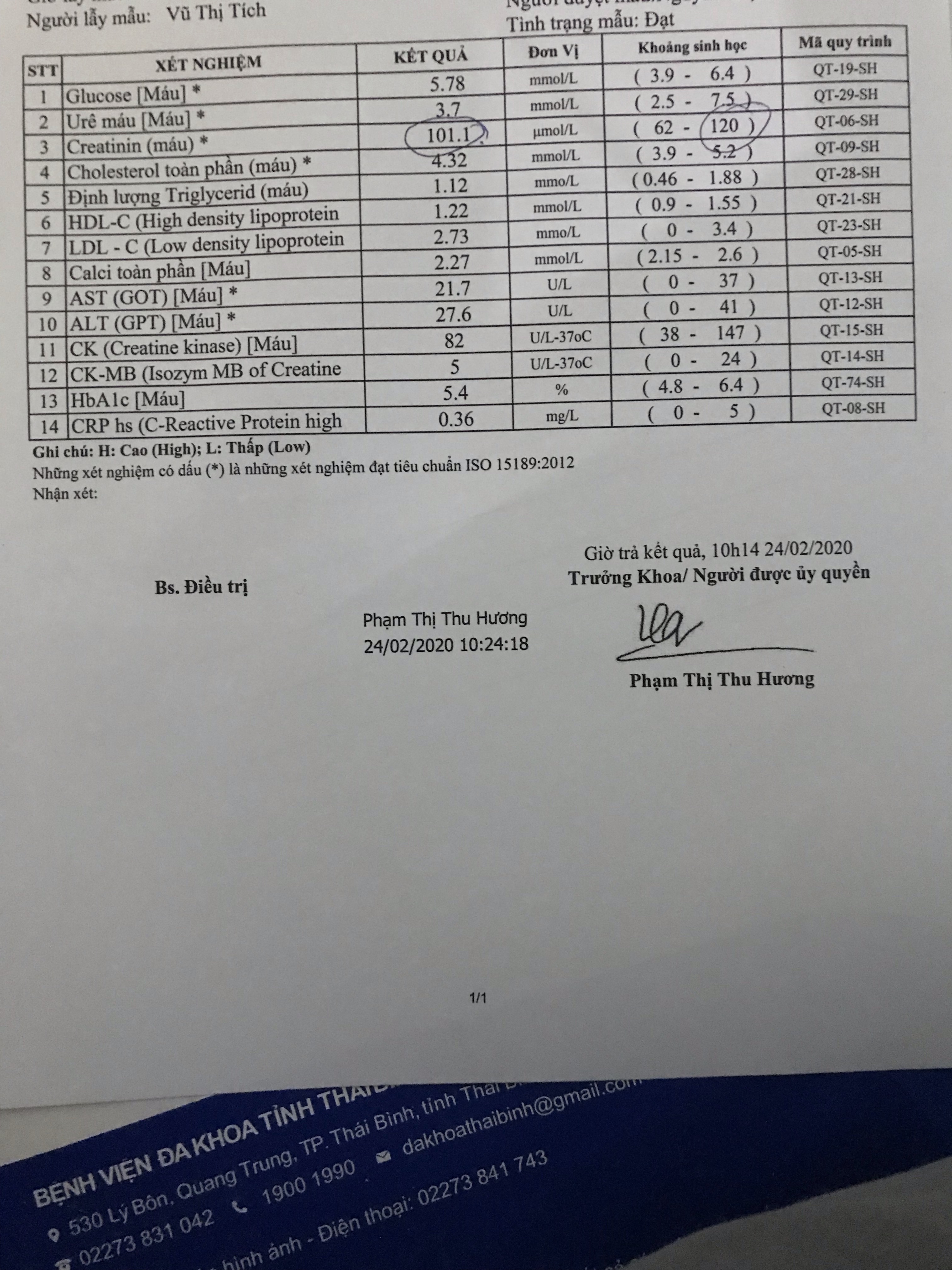 Em nam giới năm nay 30t. Nay tình cờ thấy kết quả xét nghiệm cũ. Thấy bs khoanh mục creatinin như hình. Vì lâu rồi nên k nhớ bs bảo vấn đề gì. Vậy bác sĩ cho em hỏi các chỉ số như xn máu của em có đáng lo k ạ? Em xin chân thành cảm ơn ạ!
