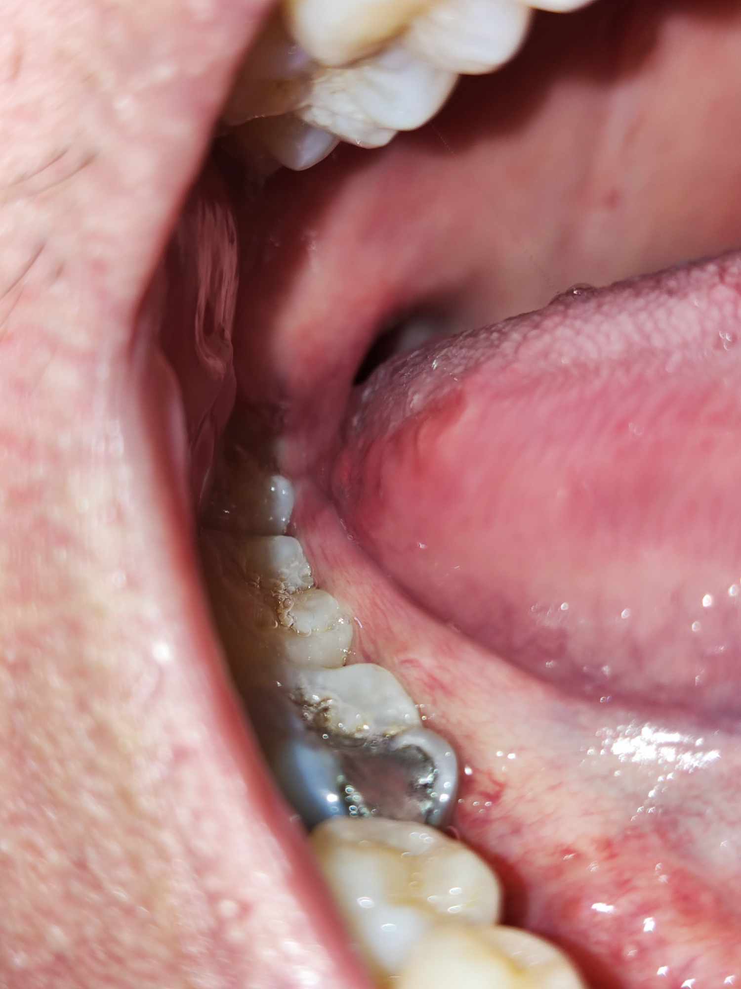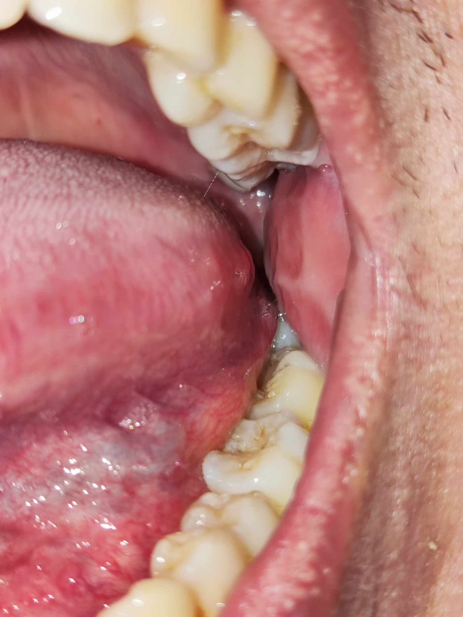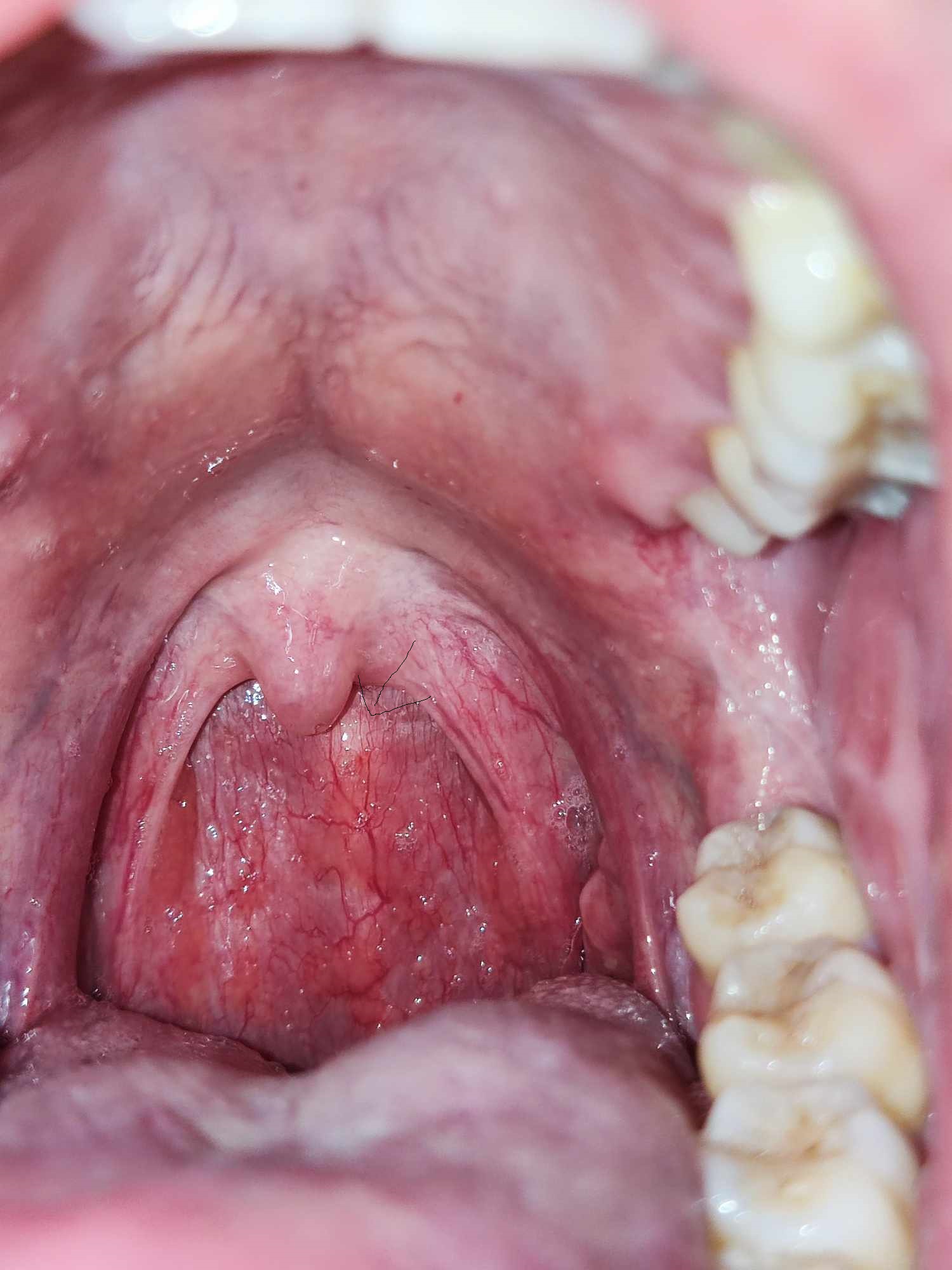 Chào bác sĩ ạ, mình bị viêm lưỡi như thế này ở 2 bên cánh lưỡi đã 1 tháng hơn không khỏi (đã có đi khám và được chuẩn đoán viêm lưỡi, kê kháng sinh kháng viêm). Không biết liệu có nên đi khám chuyên sâu không ạ. Và sau lưỡi gà mình 3 ngày nay nổi lên 1 cục, khá cấn khi nuốt nước bọt, và cứng khi dùng tăm bông chạm vào. Không biết nó là gì ạ. Mình cám ơn nhiều