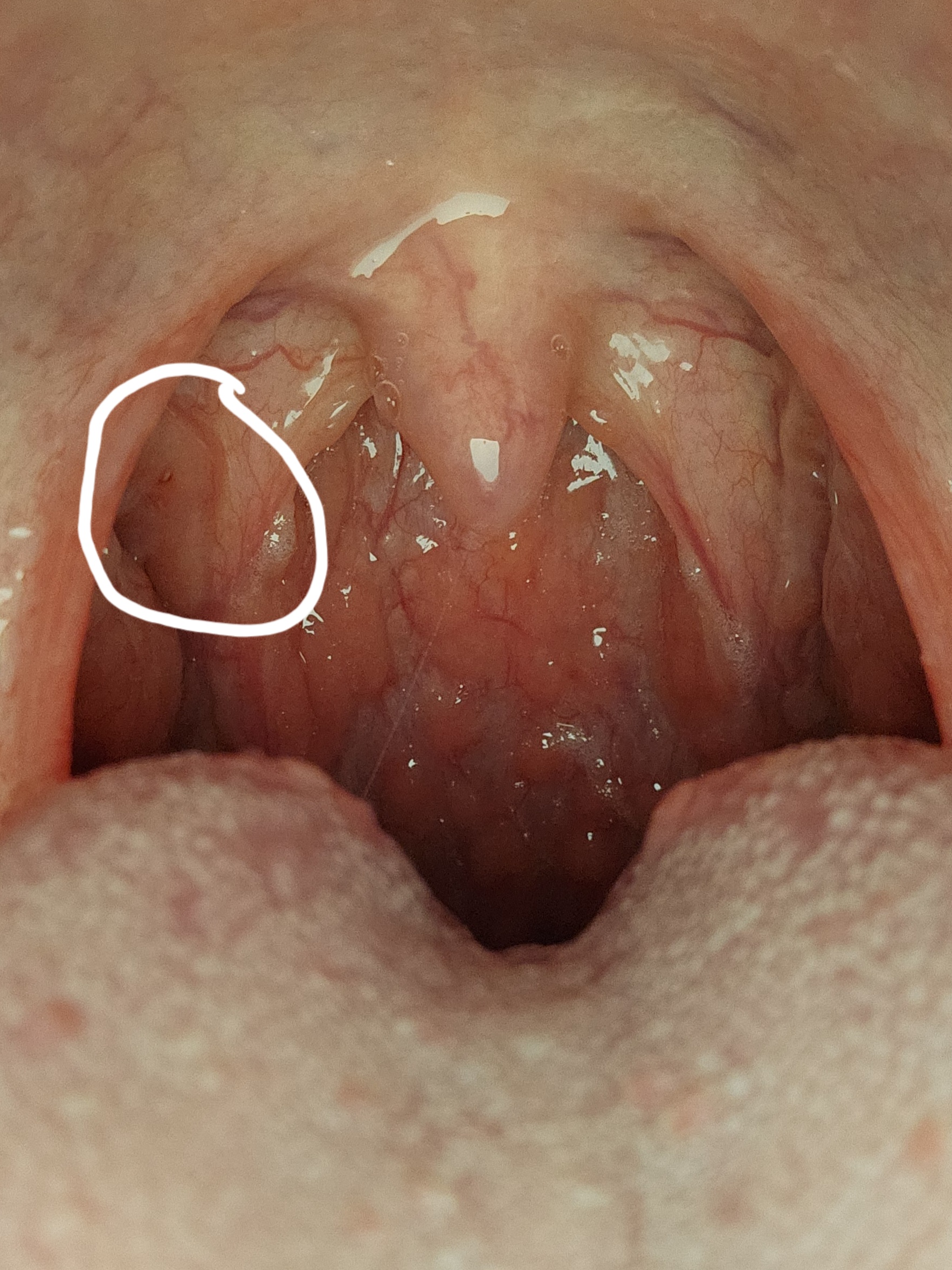 Tổn thương của em viêm họng hạt, amydal hơi to Chỗ em khoanh chấm trắng bé chưa ảnh hưởng gì