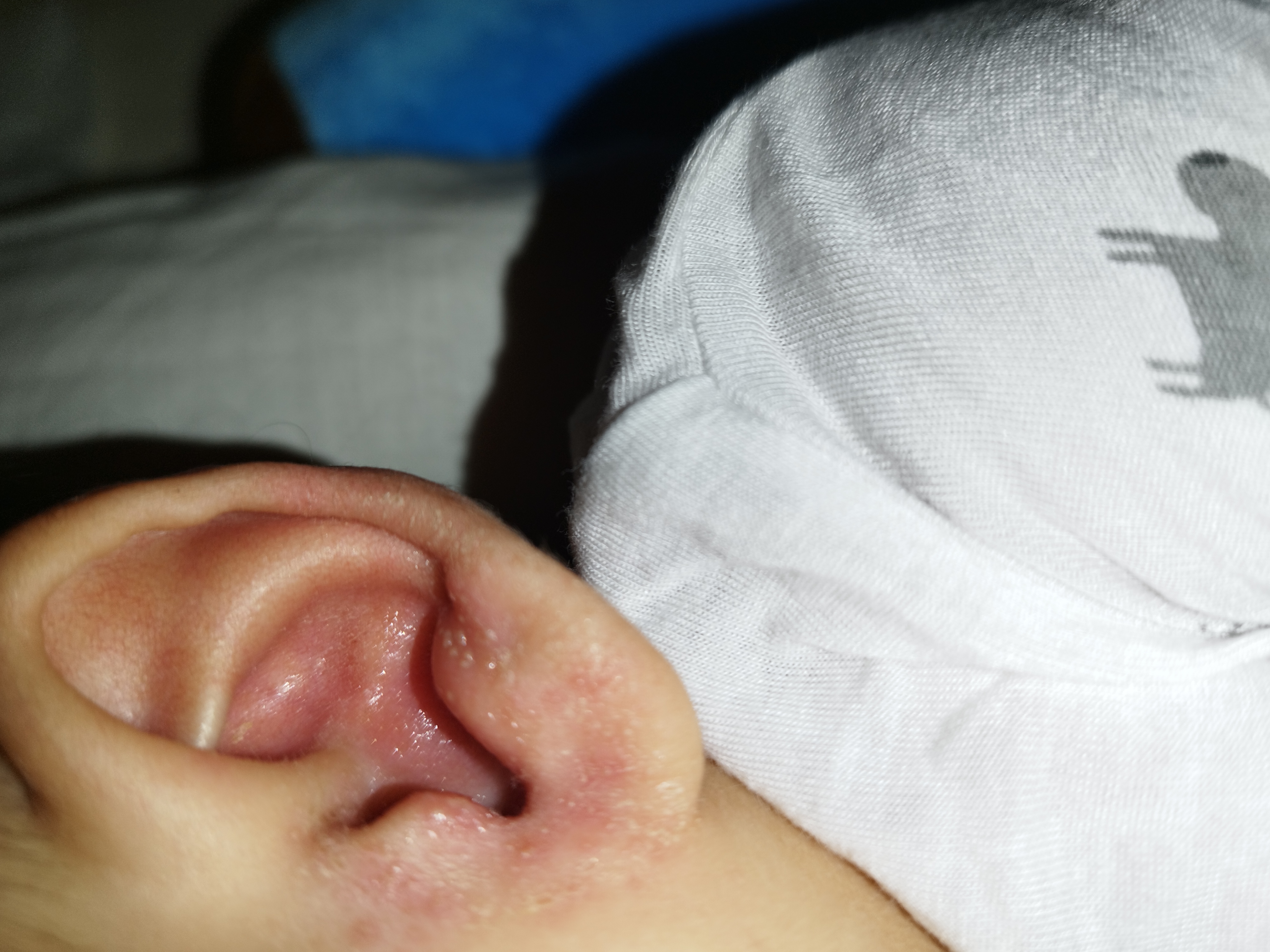 Em chào bác, Con em bé trai nay được hơn 4 tháng. Tai bé em bị nổi mụn nước da bông tróc như hình e đính kèm. Sáng nay dậy e thấy tai bé bị đỏ. E có rái tai cho bé bằng tâm bông. Rồi hiện 2 mục nước tới trưa nổi thêm vài mục rồi tối e phát hiện nhiều như hình. E thấy phát triển rất nhanh. Mong bs giúp em