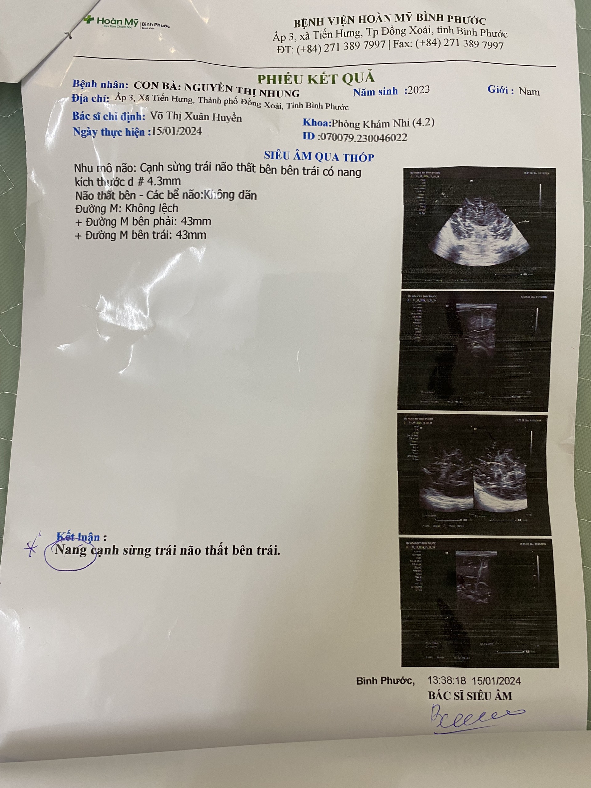 Bé tròn 1 tháng tuổi, siêu âm thóp và có kết quả là xuất hiện nang cạnh sừng trái não thất bên trái. E muốn hỏi là với trường hợp này thì để ra tết lên Nhi đồng khám lại được không ạ?