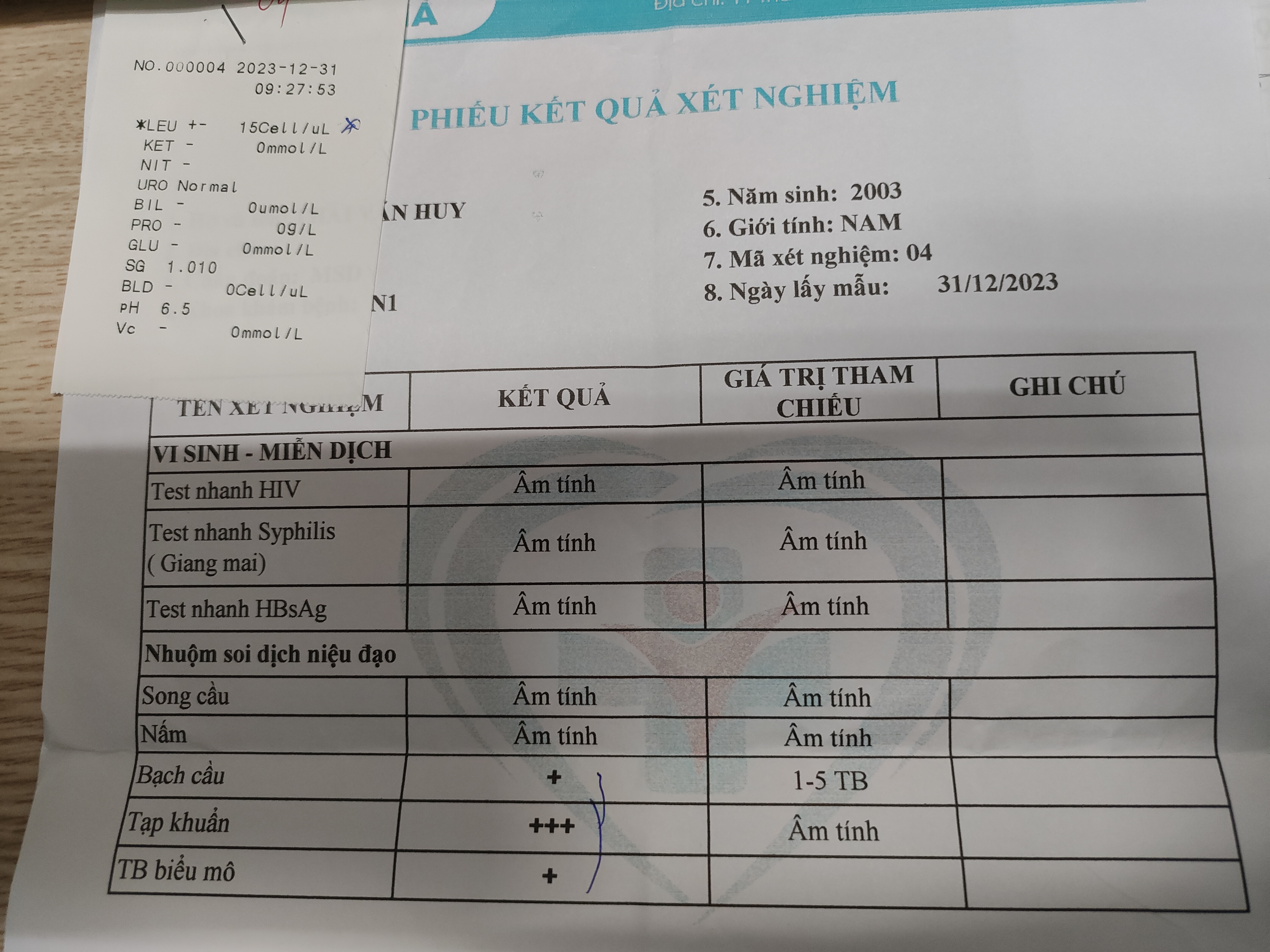 Chào bác sĩ ạ, e có đi xét nghiệm máu và dịch niệu đạo có kết quả như này . bác sĩ cho e lời tư vấn với ạ