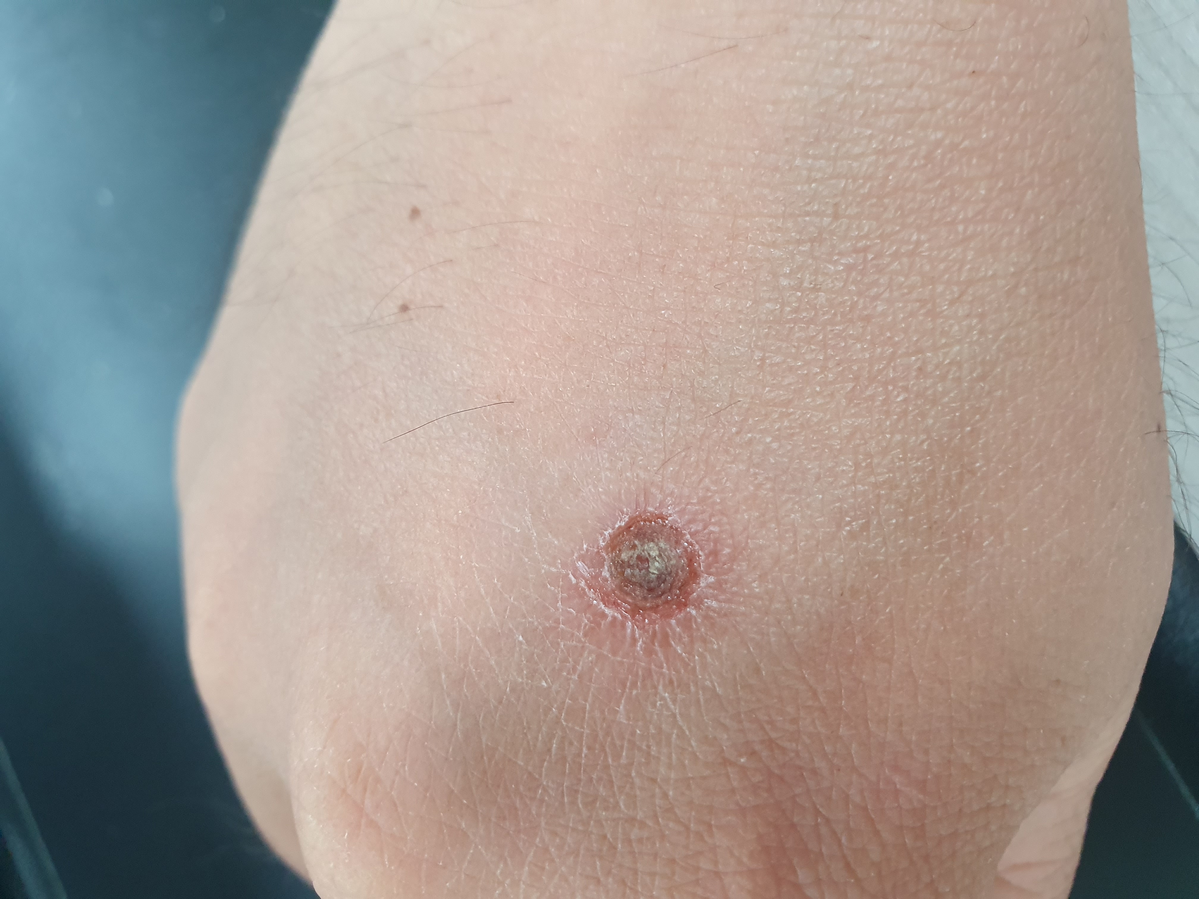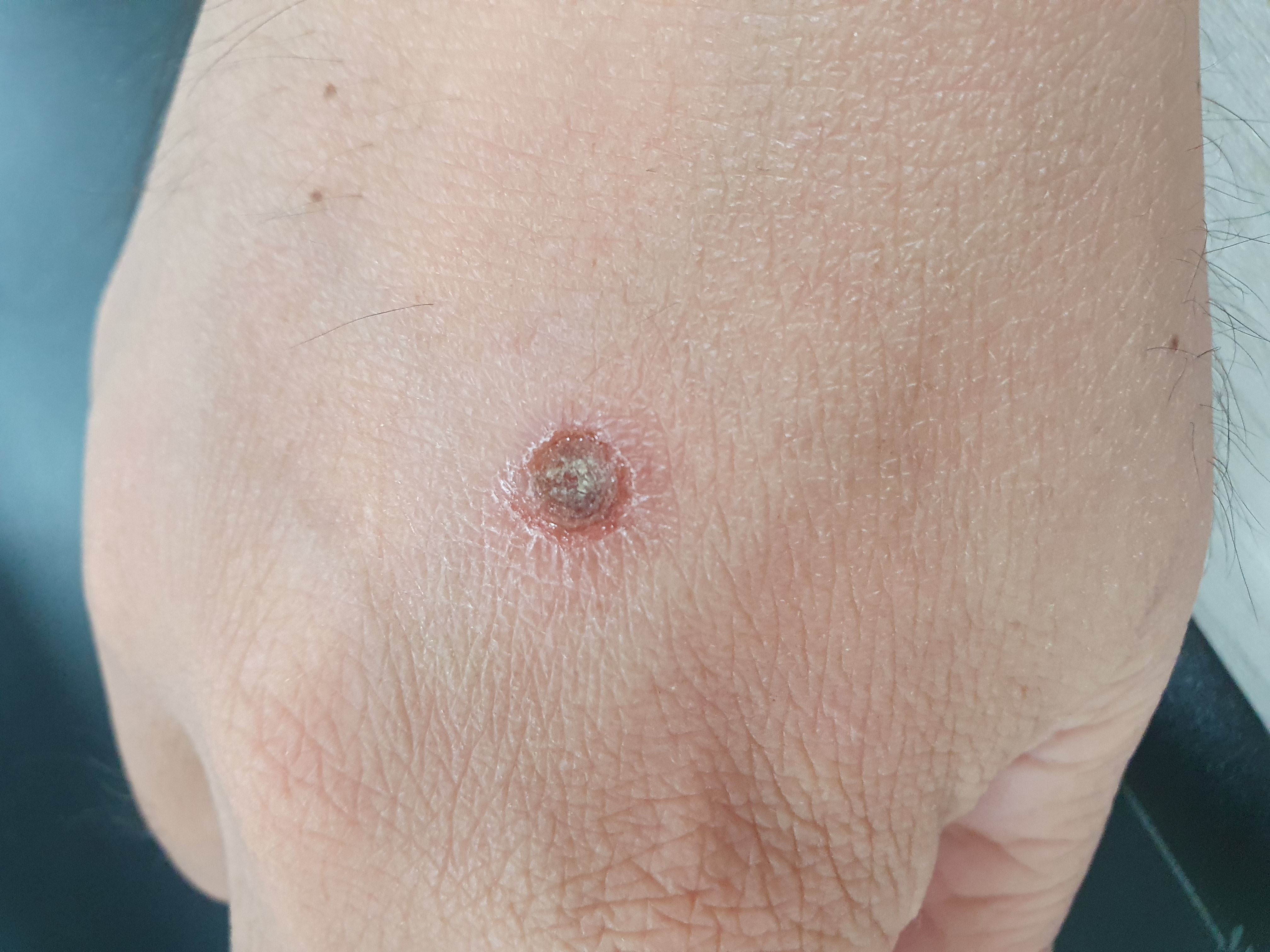 Cho em hỏi em bị cái vết này ngứa với đang đóng mày như thế này thì là nguyên nhân gì và bị bệnh lý gì thế ạ? Có thể mua gì để thoa lên vết này ạ? Em cảm ơn.