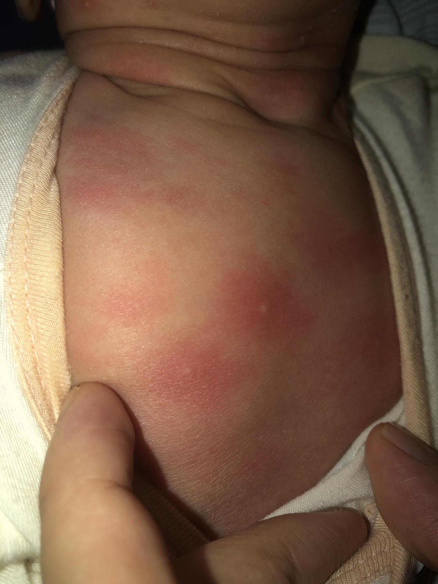Bé đuoc 23ngay tuổi bị nổi nốt nhu ảnh xin bác si tu vấn giúp a . Bé chỉ bị ở bụng còn lưng k bị và dịu bớt đỏ khi bình thường khi vặn minh hoac khóc thi nốt đỏ hơn a .bác si tu vân giúp e ạ