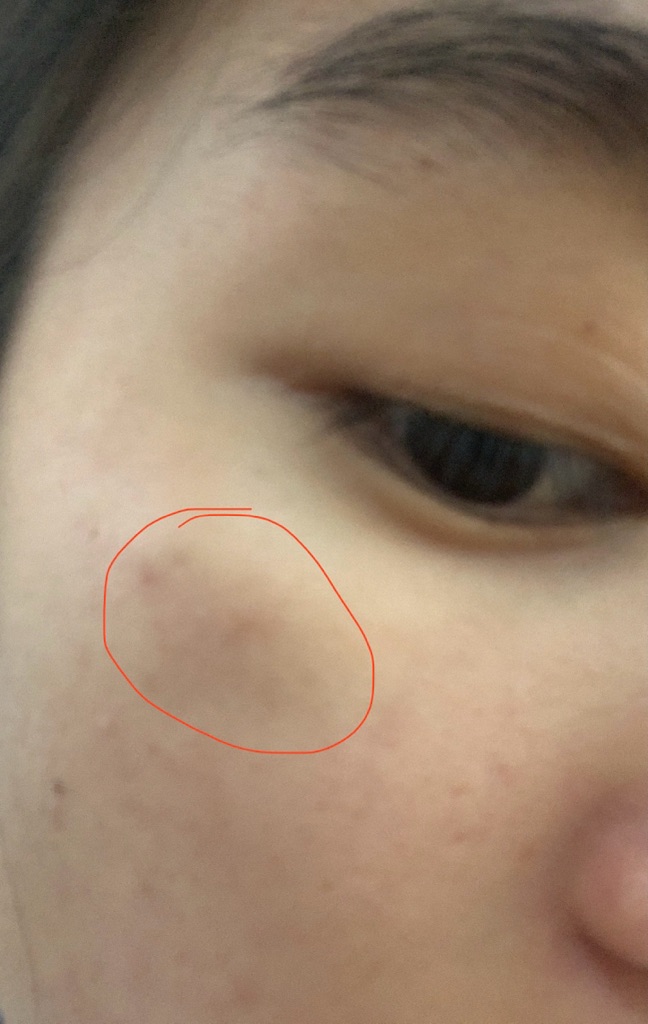 Dạ nó bị ở vùng này hiện tại thì nó đã xuống nhưng đến lúc bị là nó sẽ ửng đỏ lên ạ