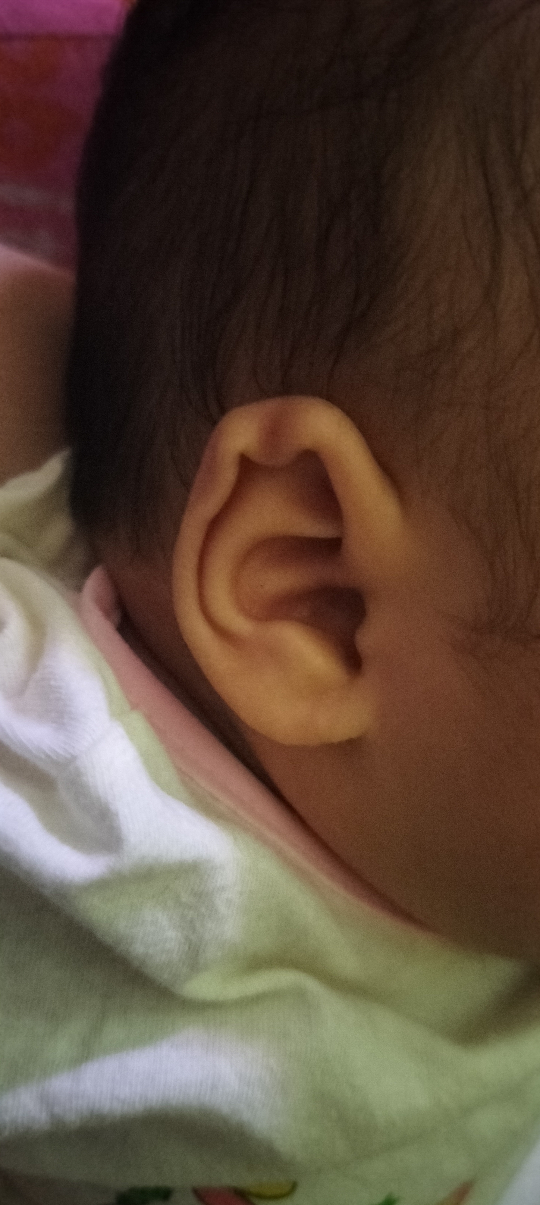 Tai như vậy nguyên nhân có thể do thiểu sụn. Có thể phát triển dần khi lớn lên. Em nên cho bé kiểm tra chuyên khoa Tai mũi họng