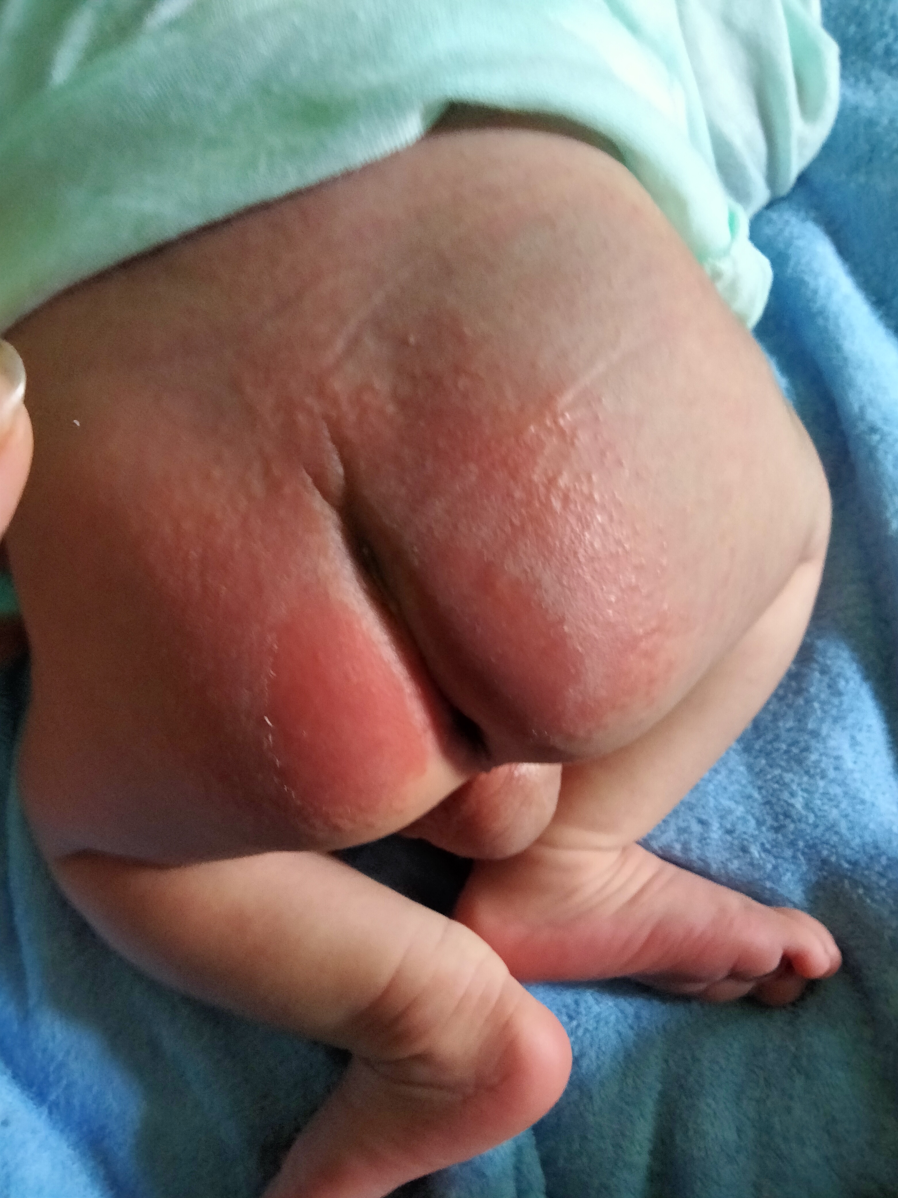 Em bé bị hăm tã nặng rồi e ơi, có cả vết loét rồi. E cho bé khám ngay để bôi thuốc ngay nhé