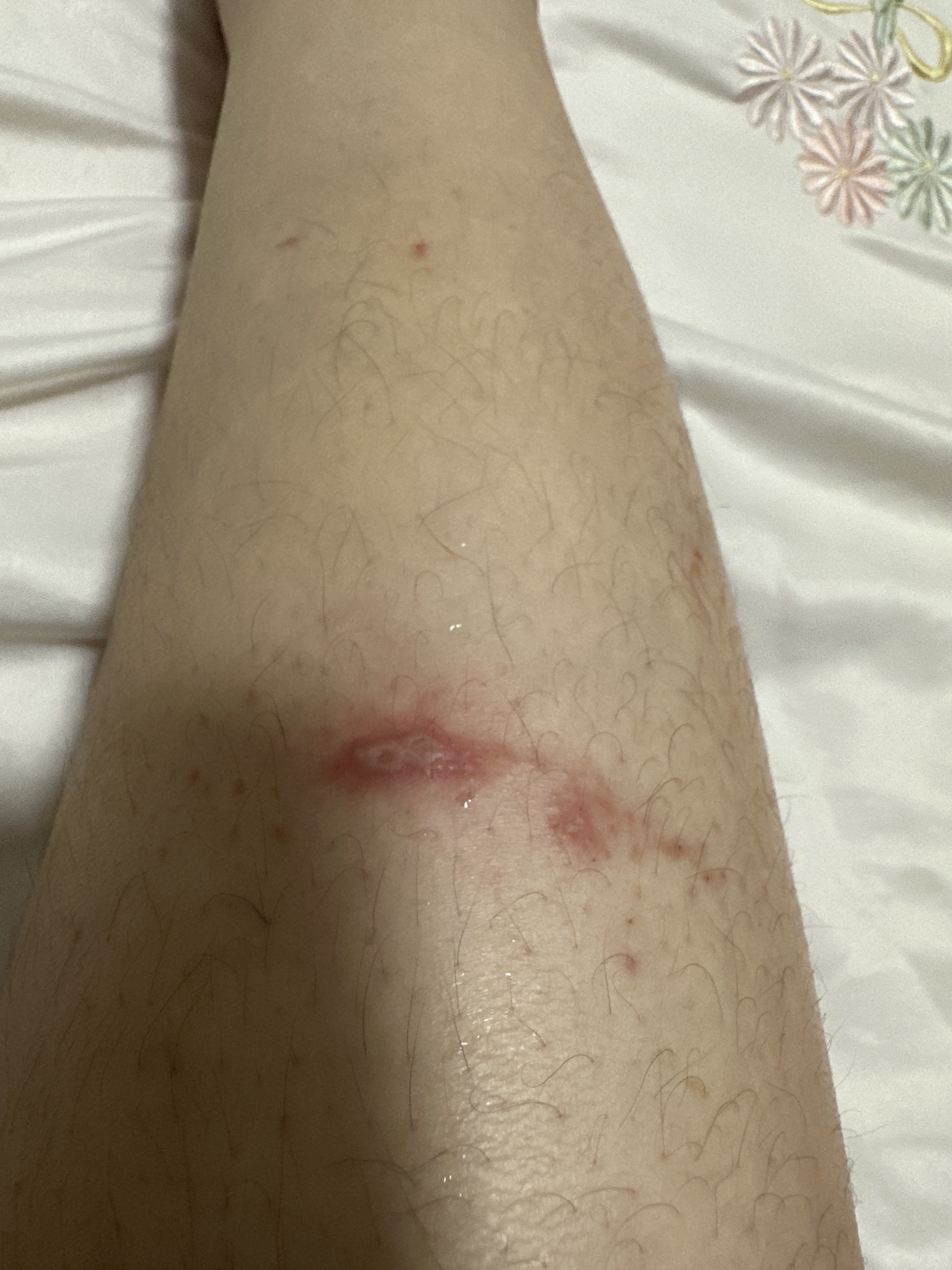 Da em có 2 nốt trên ngực rồi xuất hiện dưới cẳng chân như hình, ban đầu là nốt mụn nước nhỏ ngứa, rồi lan ra rất nhanh thành mảng đỏ, ở giữa có dộp lên. Bác sĩ cho em hỏi tình trang của em là bị gì vậy ạ?