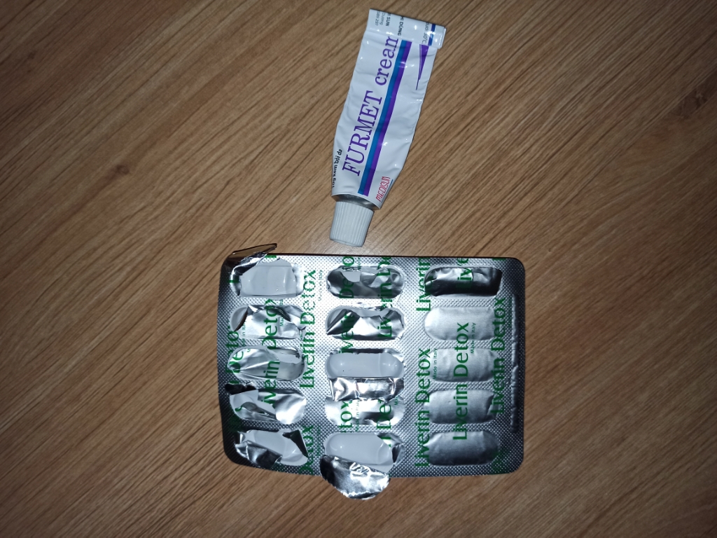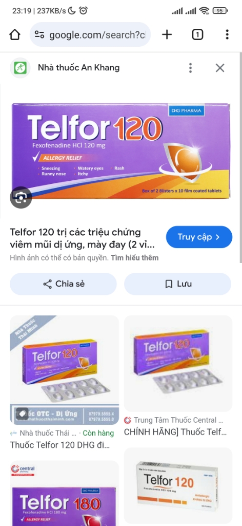 Thuốc dị ứng e đã uống hết rồi ạ. Còn lại thuốc giải độc gan và kem bôi.