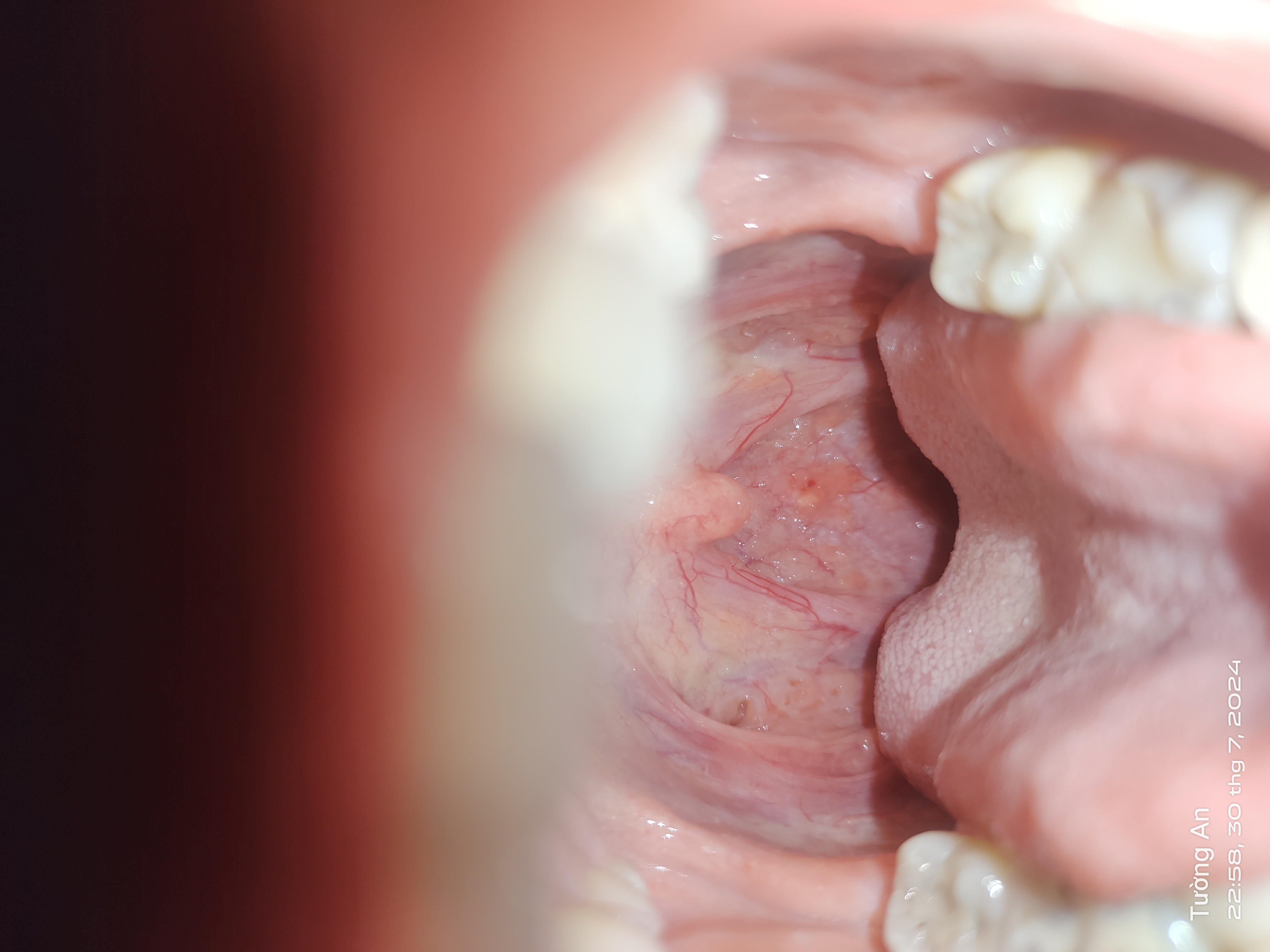 Trong thành cổ họng ngay chổ chấm đỏ có màu vàng (không phải nốt mà nó phẳng với bề mặt da) vậy cổ họng có bất thường không bs