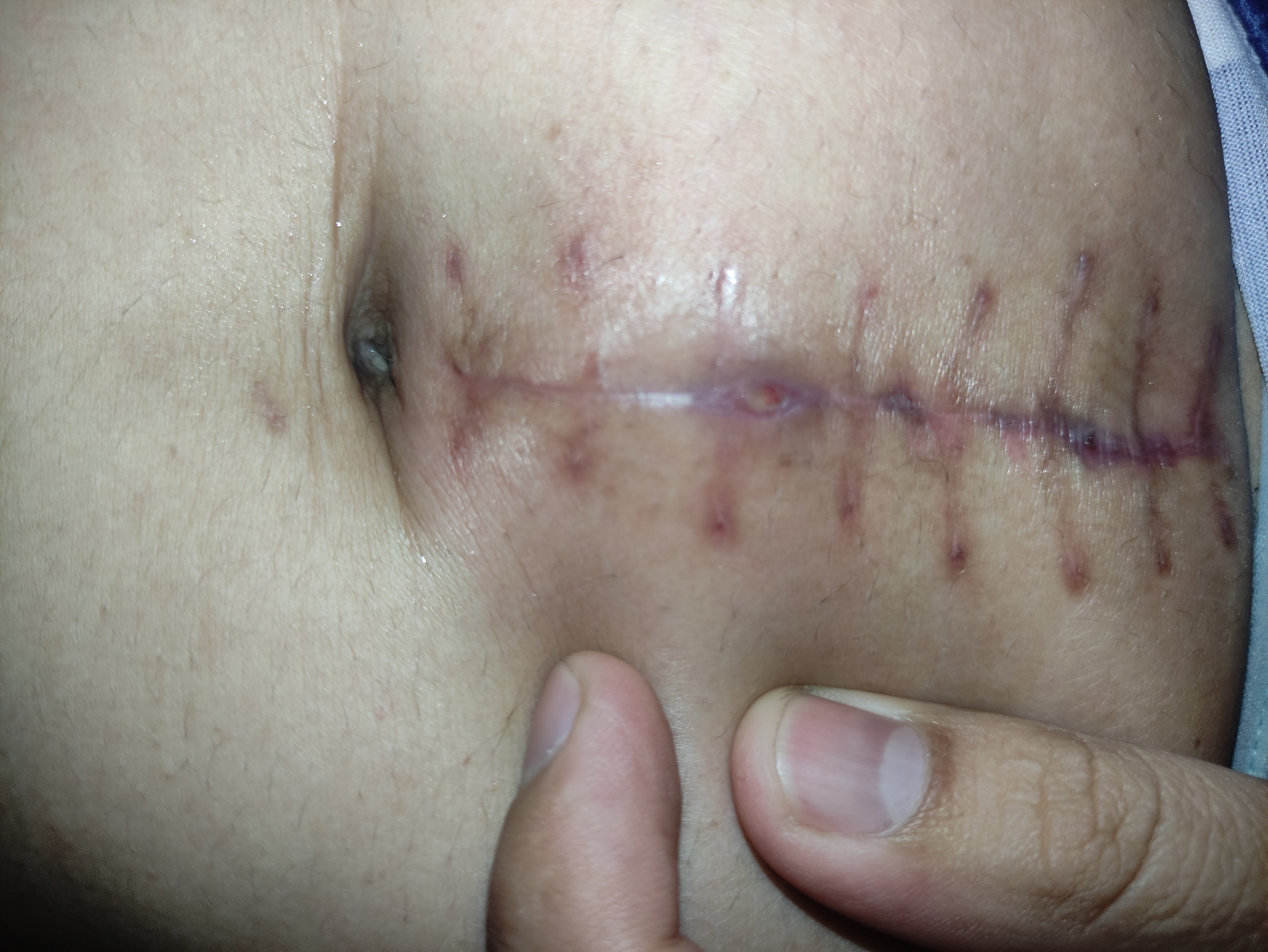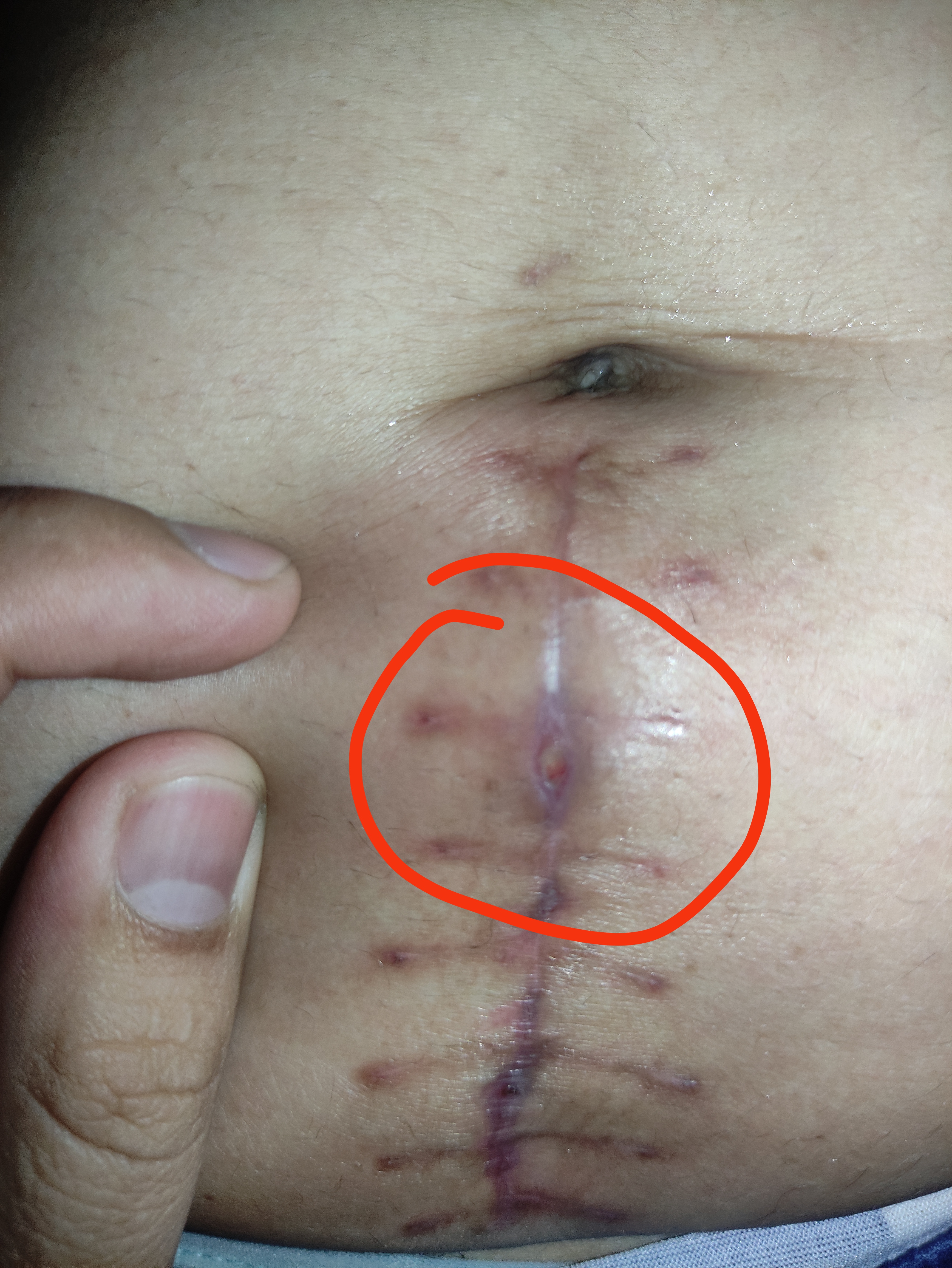 Bác sĩ ơi cho em hỏi. Em mỗ nan niệu rốn ngày 23/08. Cách đây 2 ngày chổ em tô đỏ trong hình nó căng hơn tí. Em mở ra tí vết mổ xì ra dịch vàng đỏ. Tới hôm nay còn ít nhưng hơi có mũ