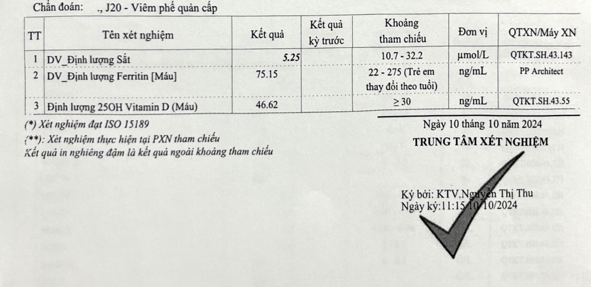Chào các Bác Sĩ! Bé nhà em hơn 3 tuổi, nặng 15.5kg. Bé làm xét nghiệm chỉ số sắt khi đi khám ho sổ mũi. Kết quả như ảnh ạ. Nhờ các Bs xem bé có cần bổ sung sắt ko ạ. Và nếu bổ sung thì bổ sung thuốc Hemopoly 5ml (chứa 50mg Fe (III)), ngày uống 10ml đc ko ạ