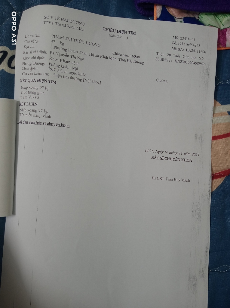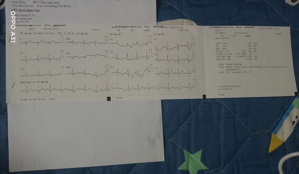 E chào bs ạ. Dạo này e thấy mệt nhiều. Khó thở ạ. Ngay cả đi bộ hay nằm đều cảm thấy khó thở. Nặng ngực trái. Thi thoảng có nhói ở xương ức ạ. E có cảm thấy tim đập nhanh. Huyết áp e thì bình thường ạ. E có khám thì trên phiếu điện tim có ghi là mạch 97l/p. Theo dõi thiểu năng vành ạ