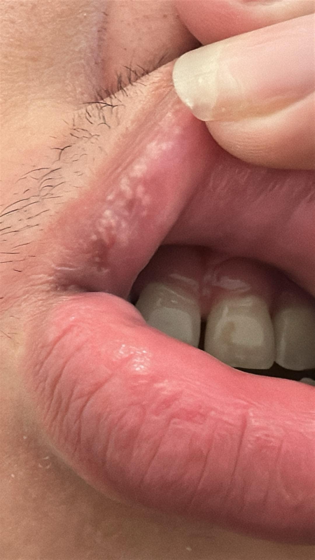 Nhờ bs xem hình ảnh môi nỗi hột như vậy là bị sao ạ! Cách điều trị như thế nào ạ? Bạn nam bị 2 ngày nay ,không ngứa ko rát,không đau gì ạ