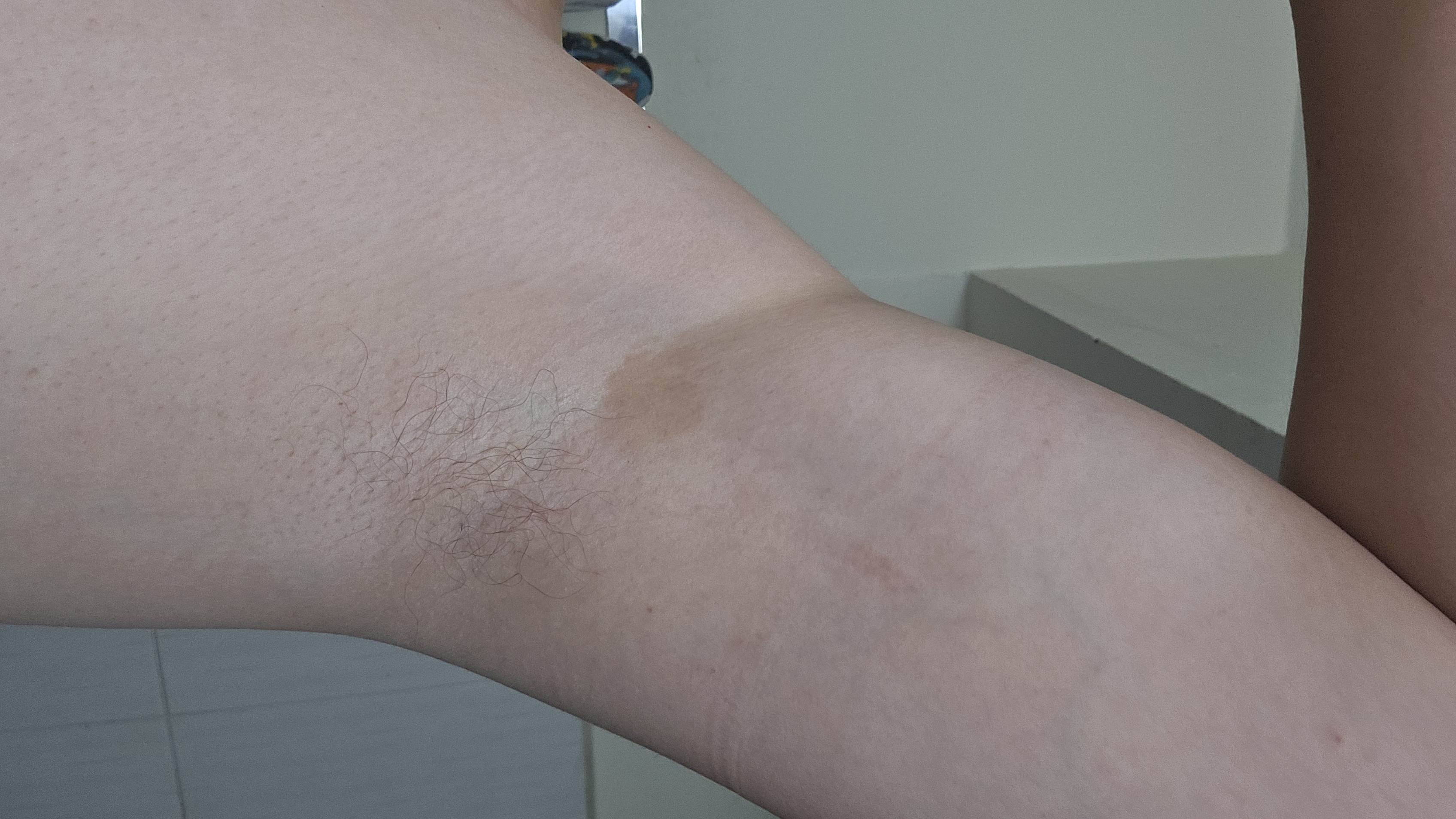 Vùng da dưới 2 bên cánh tay em xuất hiện vết thâm như này đã lâu, không đau không ngứa, chạm vào cũng ko có cảm giác sần sùi, chỉ hơi khô so với vùng da ko bị xung quanh. Vết bên trái thì đã tự nhỏ dần đi, nhưng bên phải lại lan rộng dần ra. Bác sĩ check giúp em xem là triệu chứng gì và điều trị như thế nào với. Cám ơn bác sĩ.