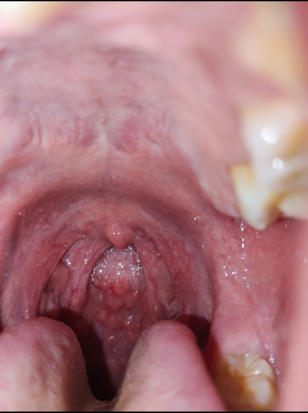 dạ cháu chào bác sĩ ạ, hồi 27/6 á con bị nổi hạt ở vòm họng kèm theo như ho nhẹ, khạc đờm nhiều, nuốt đau nhẹ con có uống thuốc thì nó bớt dần các triệu chứng như nuốt đau, ho ít lại mà hạt vẫn còn nhưng nhỏ hơn lúc đầu, lúc đó con có tìm trên mạng là cái này thường liên quan đến ung thư vòm họng nên con bị stress kéo dài (con ko uống rượu bia, hút thuốc hay ăn đồ muối/lên men đâu ạ, ảnh đầu là từ 27/6, ảnh thứ 2 là hiện tại ạ)