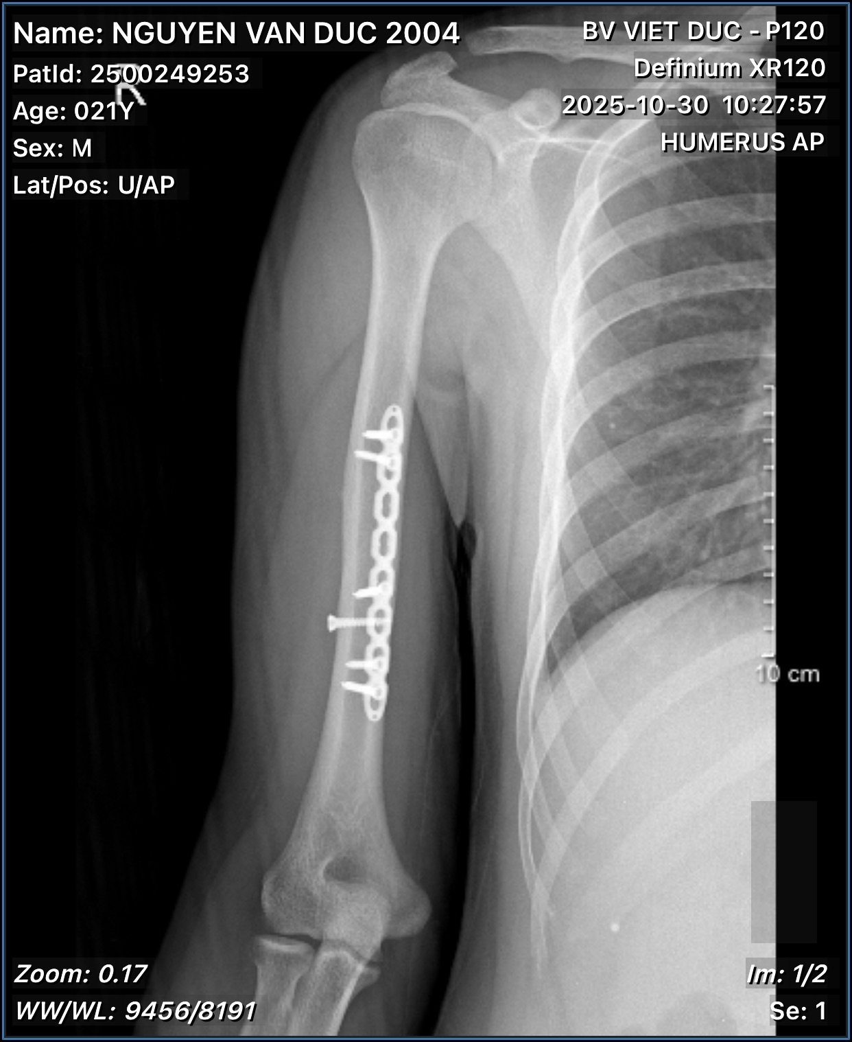 Bác sĩ ơi cho em hỏi đây là ảnh phim sau 1 năm gãy xương cánh tay của em, qua ảnh thì xương của em đã liền được tốt chưa ạ và có thể chơi thể thao chưa ạ