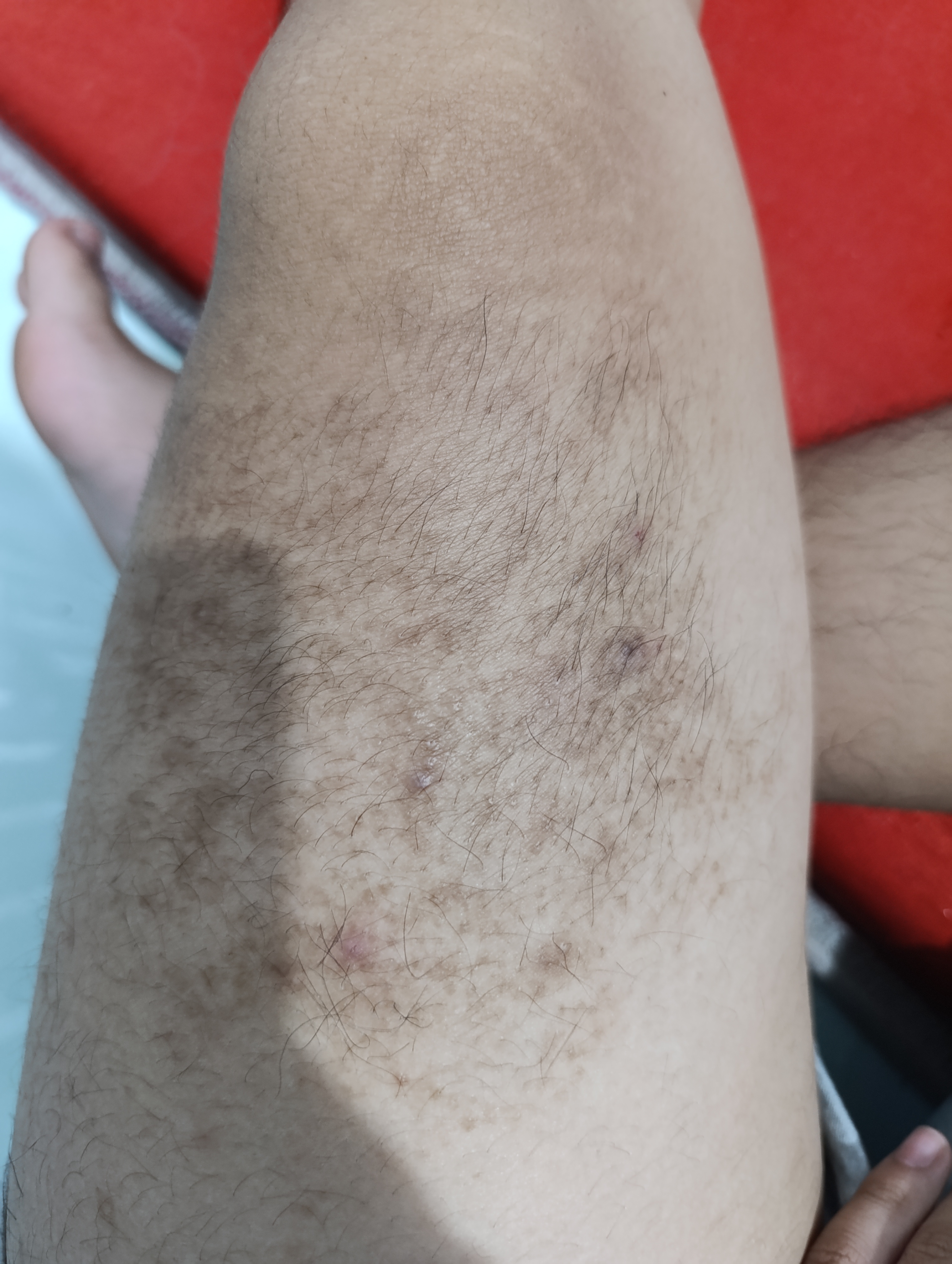 Chào bạn, khi ngứa cộng thêm việc gãi làm tổn thương da, sau đó sẽ để lại các dát thâm như trên, nó sẽ mờ dần theo thời gian. Nếu muốn phục hồi tổn thương da sớm, bạn nên gặp bác sĩ da liễu để được thăm khám và điều trị