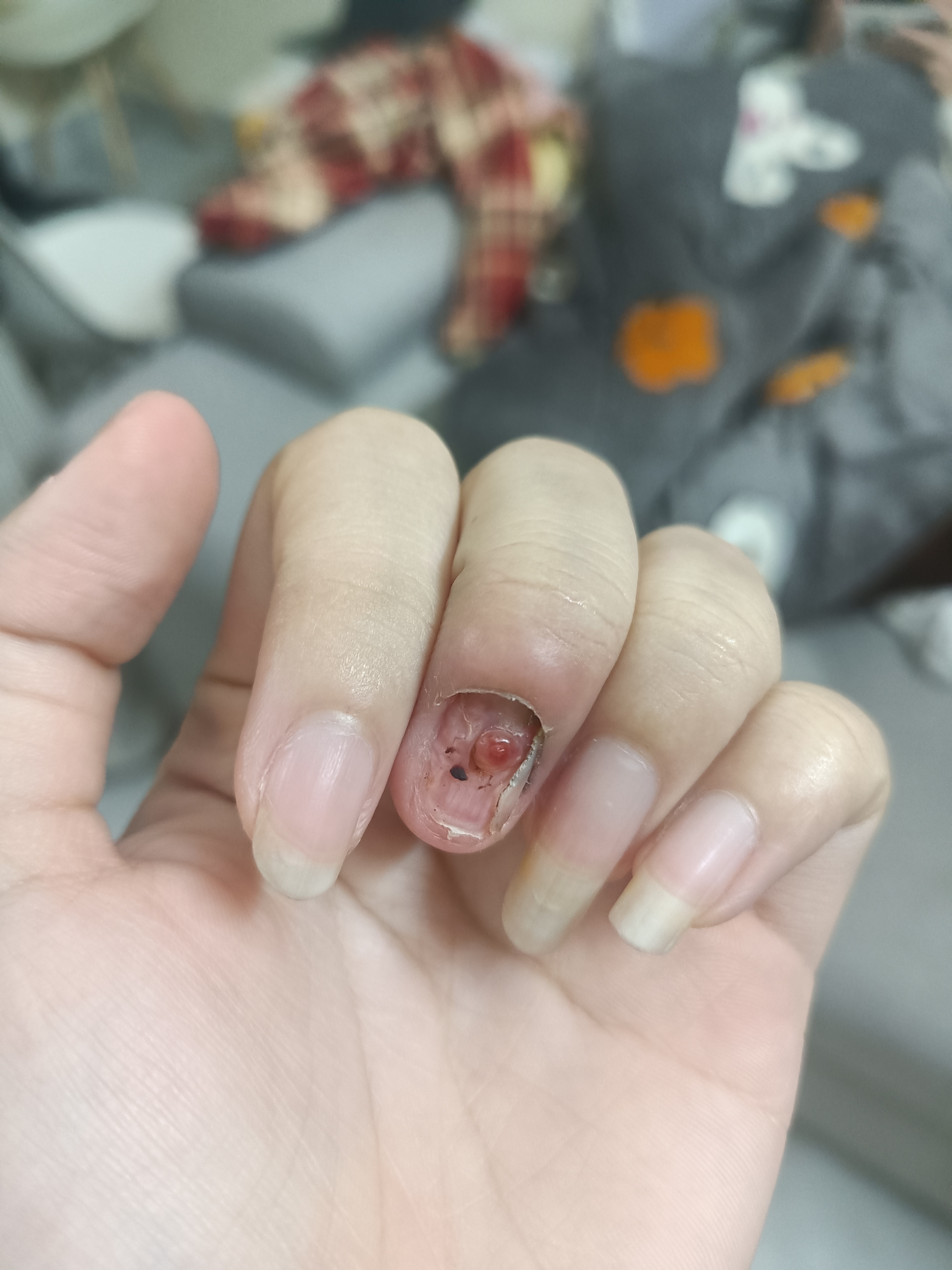 móng tay em bị dập do kẹp tay vào cửa kính hiện tại móng cũ đã bong ra và không đau đớn gì nhưng có 1 mục thịt ở trên móng ạ cnay là gì và có nguy hiểm k ạ có cần đến bệnh viện để can thiệp không hay để dần nó tự hết ạ em cảm ơn ạ