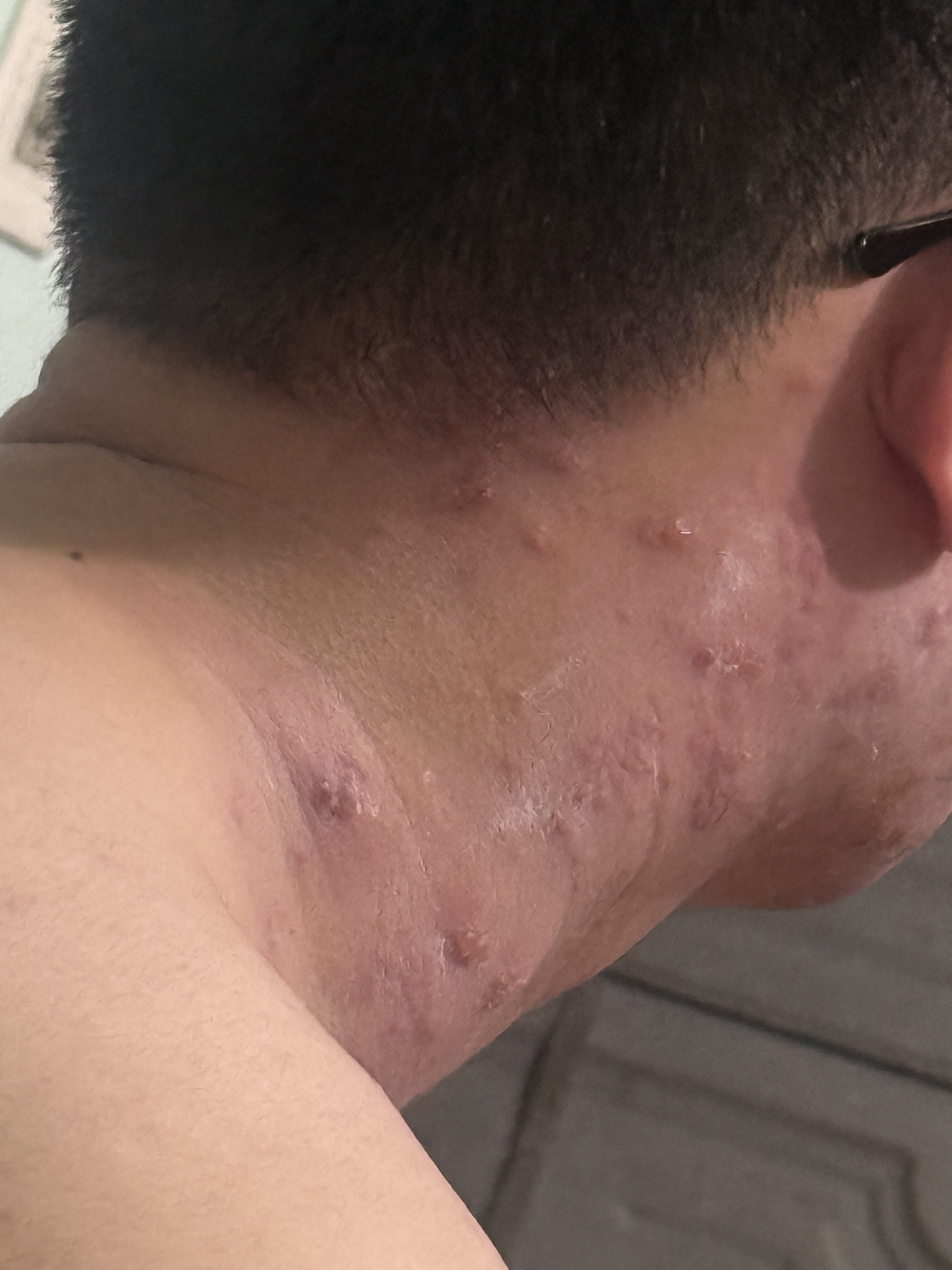 Dựa trên thông tin em cung cấp: Đau đầu, đau vùng cổ Có ban đỏ và mụn nước ở cổ/đầu Bác sĩ chẩn đoán Zona thần kinh Đang dùng Aciclovir => Khả năng cao em đang ở giai đoạn hoạt động sớm của zona. Đây là giai đoạn virus đang gây viêm dây thần kinh, nên đau đầu và đau cổ là khá thường gặp.