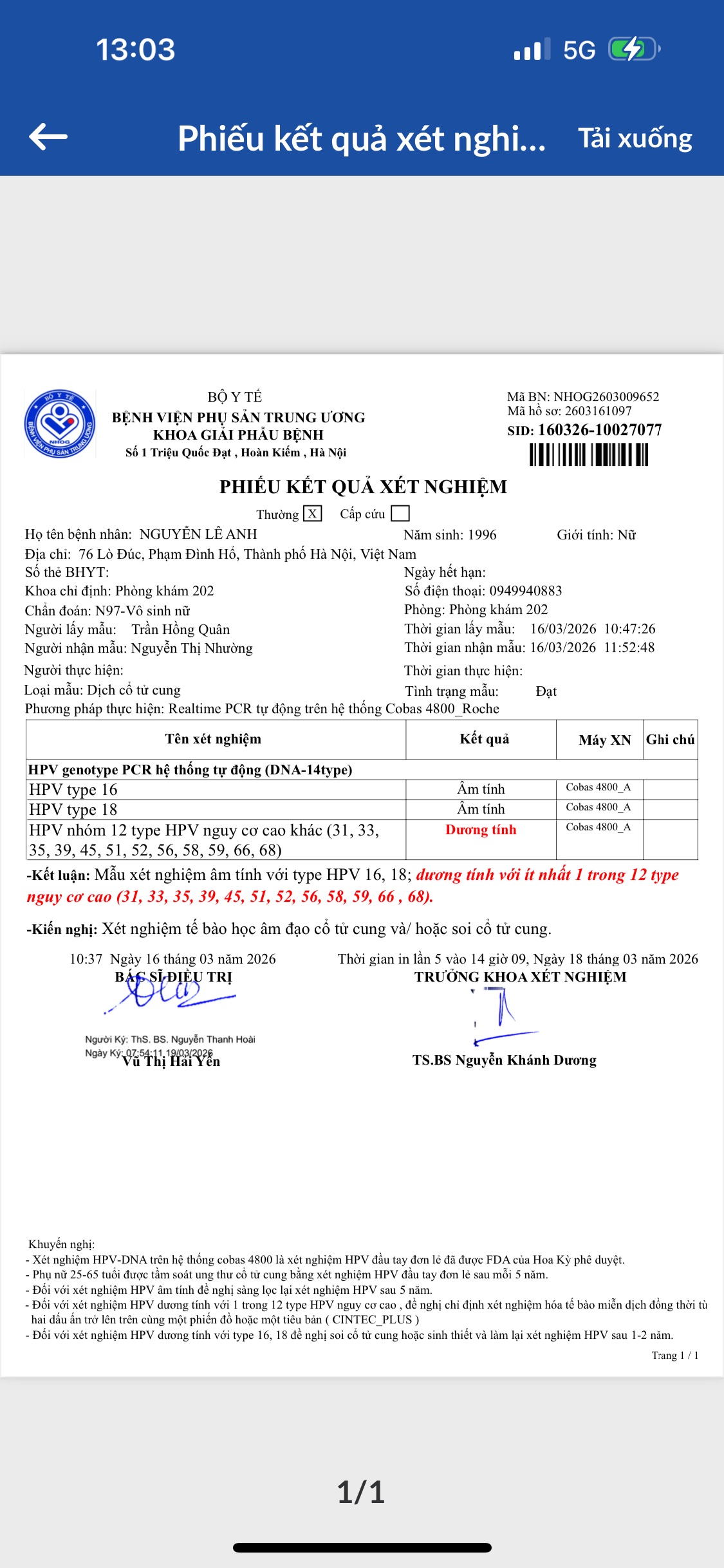 Chào bác sĩ ạ. Em vừa có kết quả xét nghiệm dịch cổ tử cung và dương tính với ít nhất 1 trong 12 type HPV nguy cơ cao. Cho em hỏi bước tiếp theo e phải khám và làm những xét nghiệm gì ạ?