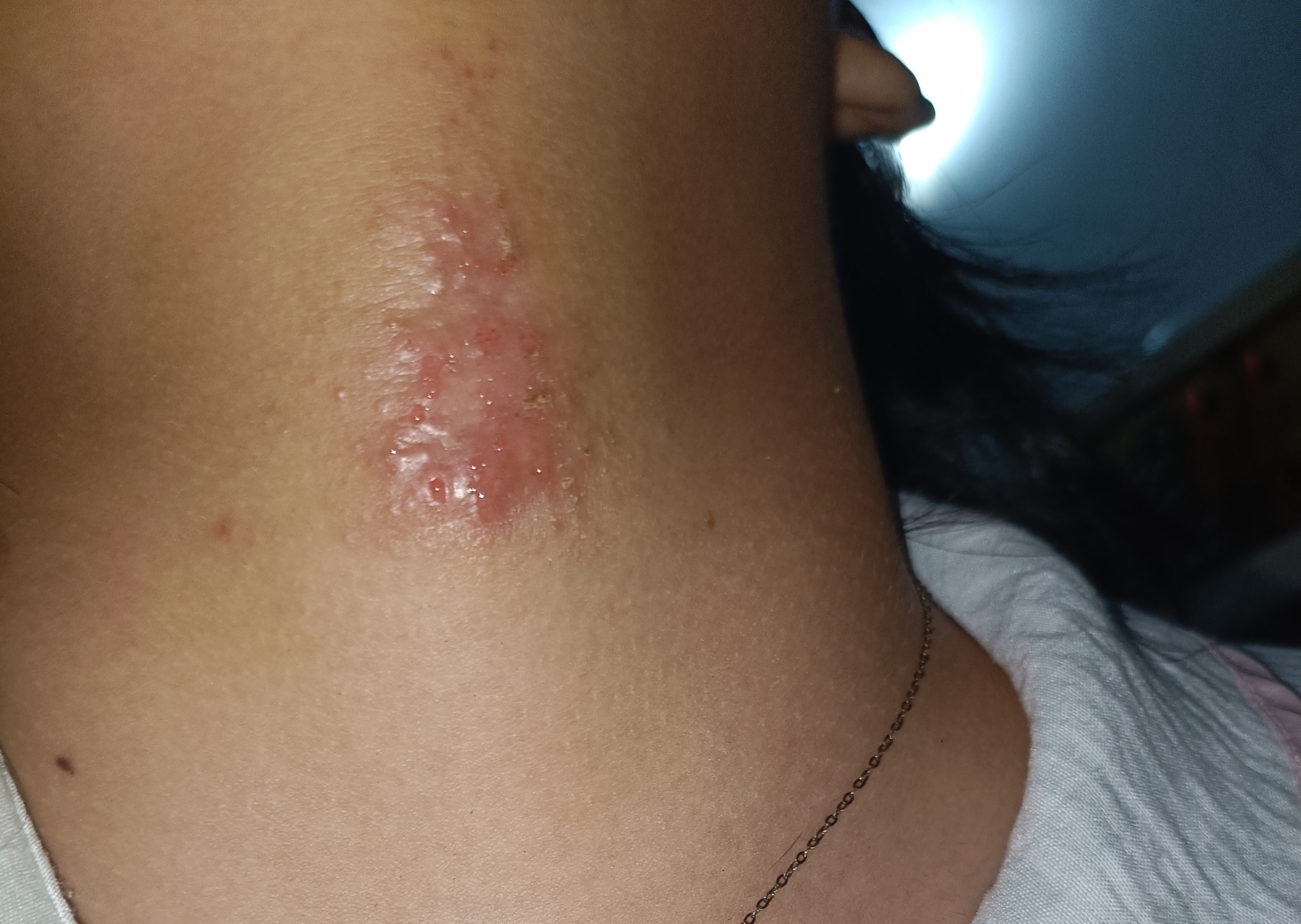 Cổ em bị như này hơn 1 tháng rồi , đổ mồ hôi là nó ngứa , gãi thì nó ra nước ấy ạ , càng gãi càng ngứa là bị sao ạ , làm cách nào hết ạ
