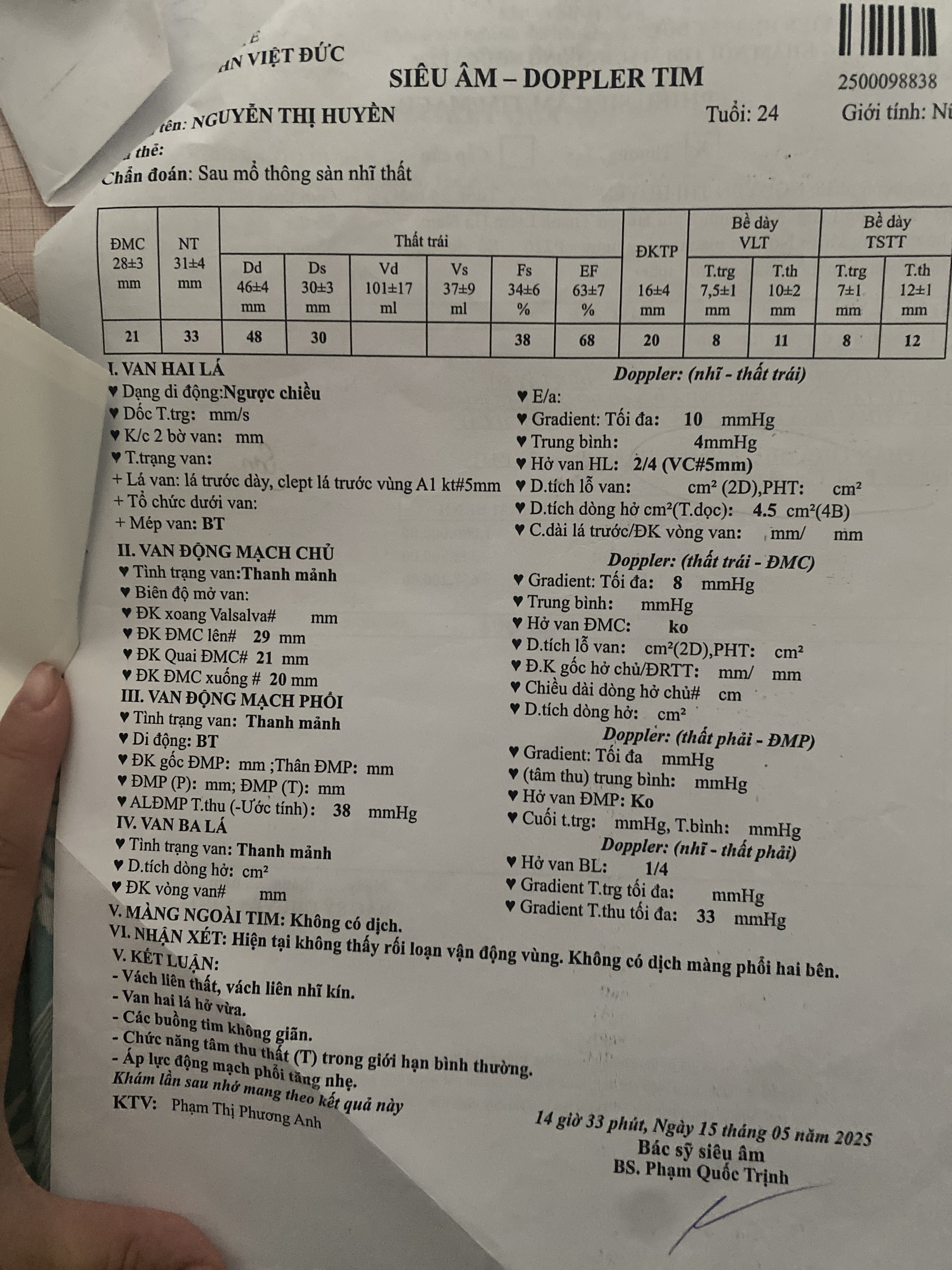 Sau mổ thông sàn nhĩ thất hở van 2/4 có đẻ con được không